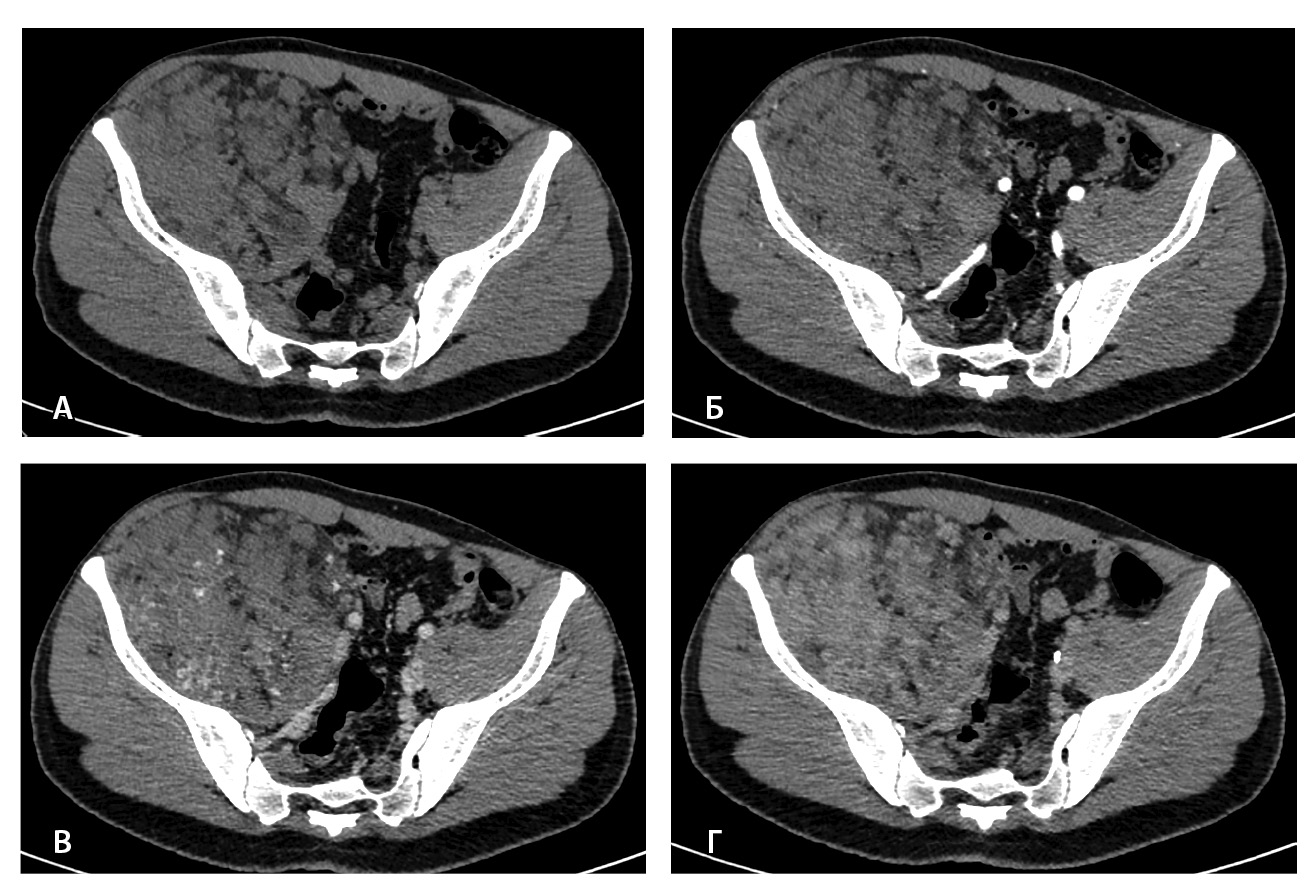 Рис. 1. Мультиспиральная компьютерная томография органов брюшной полости и забрюшинного пространства с болюсным внутривенным контрастированием: А – нативная фаза, Б – артериальная фаза, В – венозная фаза, Г – отсроченная фаза. Крупное гетерогенной структуры образование забрюшинного пространства справа, с фокусами гиперваскуляризации в структуре. Тесно прилежит к крылу подвздошной кости и подвздошным сосудам, оттесняя последние медиально