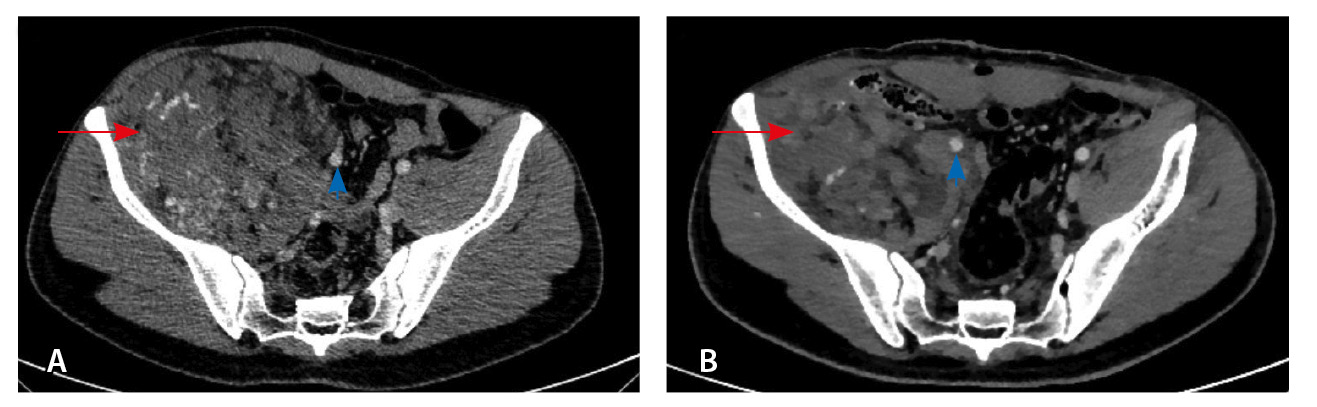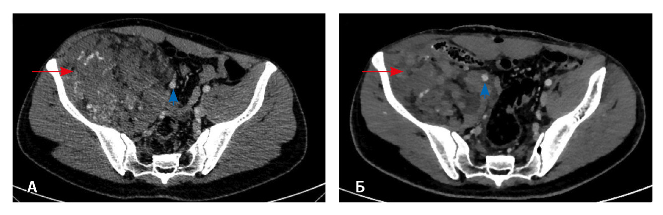 Рис. 3. Мультиспиральная компьютерная томография органов брюшной полости и забрюшинного пространства с болюсным внутривенным контрастированием, венозная фаза. А – исследование до операции, Б – исследование после операции: резидуальный фрагмент образования (красная стрелка) тесно прилежит к подвздошной кости и подвздошным сосудам (головка синей стрелки)