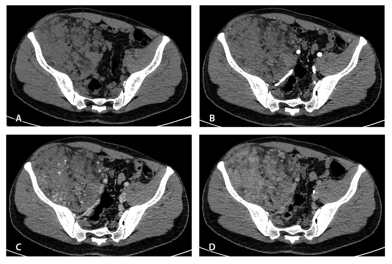 В течение 2022 г. в НМИЦ хирургии им. А.В. Вишневского наблюдался пациент мужского пола в возрасте 23 лет, обратившийся с жалобами на наличие объемного новообразования, локализованного в туловище, малом тазу и распространяющегося на правое бедро. У пациента длительный анамнез эпизодически возникающих болей в правой паховой области (жалобы беспокоят в течение 7–8 лет). После консультации хирурга с целью уточнения диагноза и оценки распространенности образования была назначена КТ органов брюшной полости, малого таза, нижних конечностей с 4-фазным контрастным усилением. КТ была проведена дважды – 1 раз до и 1 раз после оперативного вмешательства. Исследования выполнялись на 64-срезовом томографе Ingenuity CT (Philips, Нидерланды).