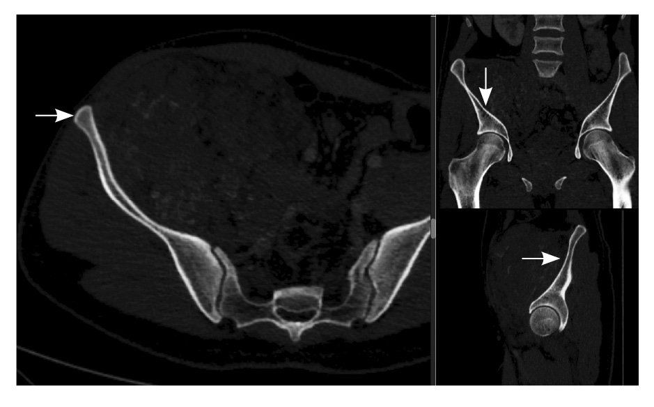 Рис. 2. Мультиспиральная компьютерная томография органов брюшной полости и забрюшинного пространства, режим костного окна. Кортикальный слой правой подвздошной кости прослеживается равномерно на всем протяжении, без признаков деструкции (стрелки)