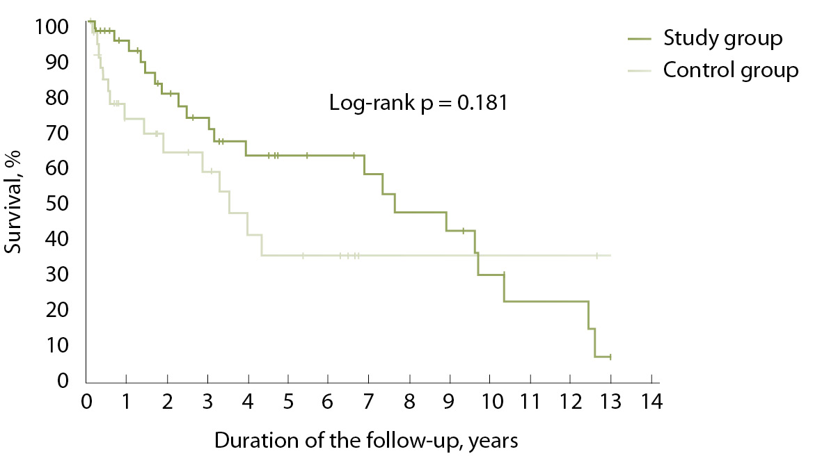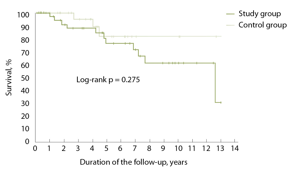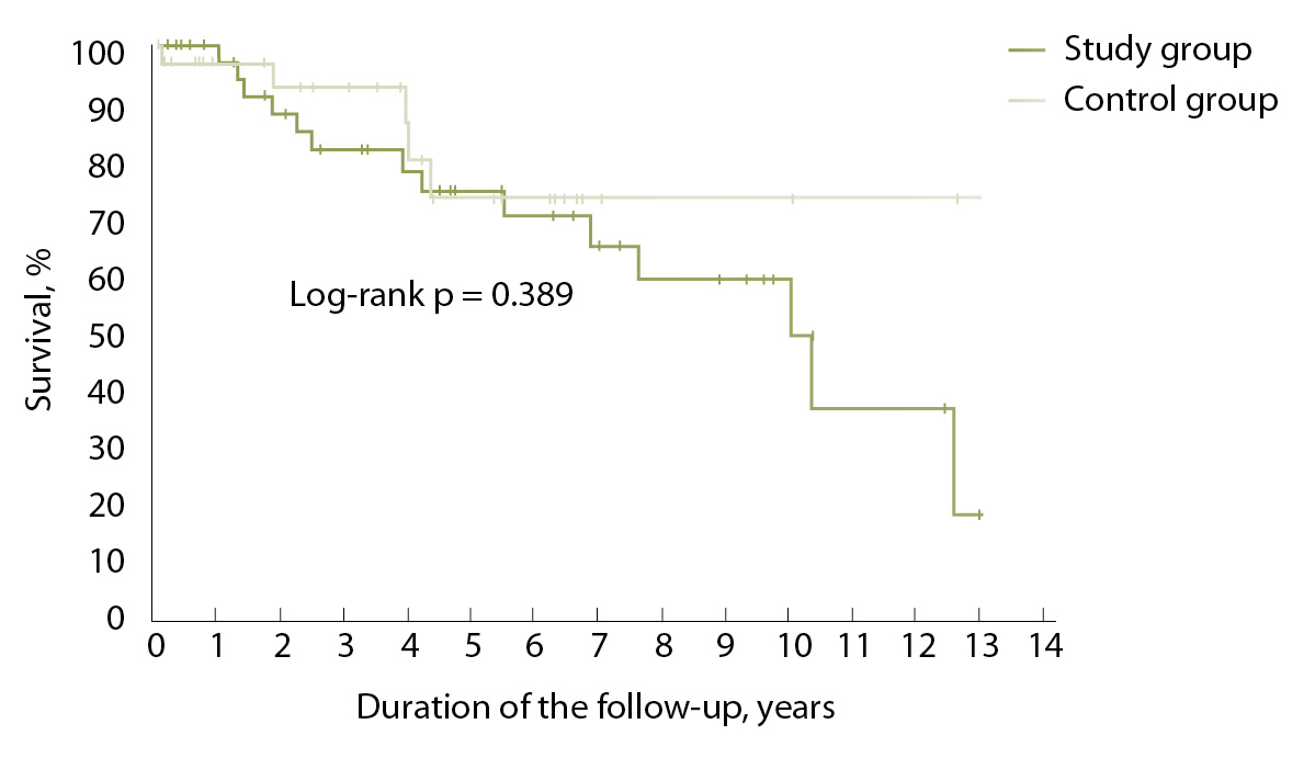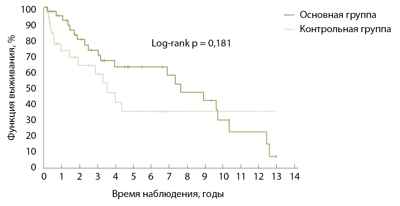 Значимых различий выживаемости без снижения СКФ между основной группой и группой сравнения не наблюдалось, хотя визуально кривые выживаемости основной группы выглядят хуже.
