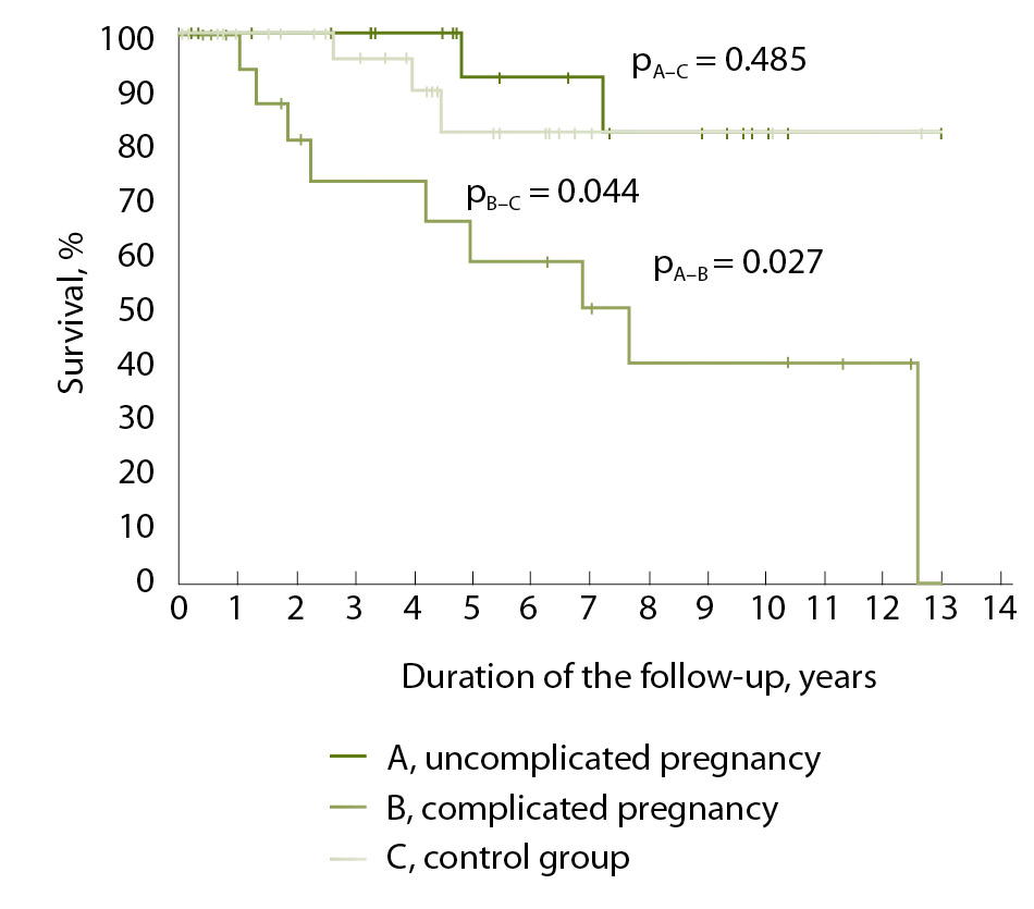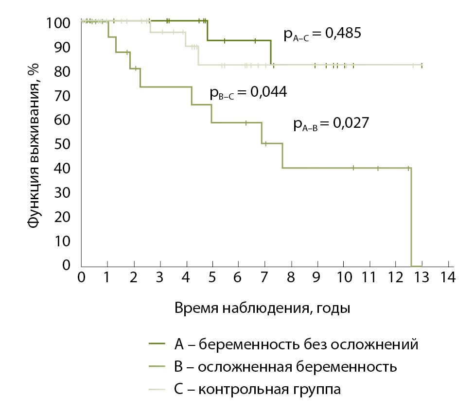 Учитывая клиническую неоднородность группы пациенток, выносивших беременность, мы разделили ее на две подгруппы – с неосложненной беременностью и с осложненной, протекавшей с преэклампсией, декомпенсированной фетоплацентарной недостаточностью, нарастанием протеинурии, ухудшением течения АГ, ОПП. При сравнении ренальной выживаемости между подгруппами и относительно группы контроля оказалось, что выживаемость без терминальной ХПН была значимо хуже у пациенток с осложненной беременностью, в сравнении как с группой без беременностей (p = 0,044), так и с пациентками, у которых была неосложненная беременность; p = 0,027 (рис. 4).