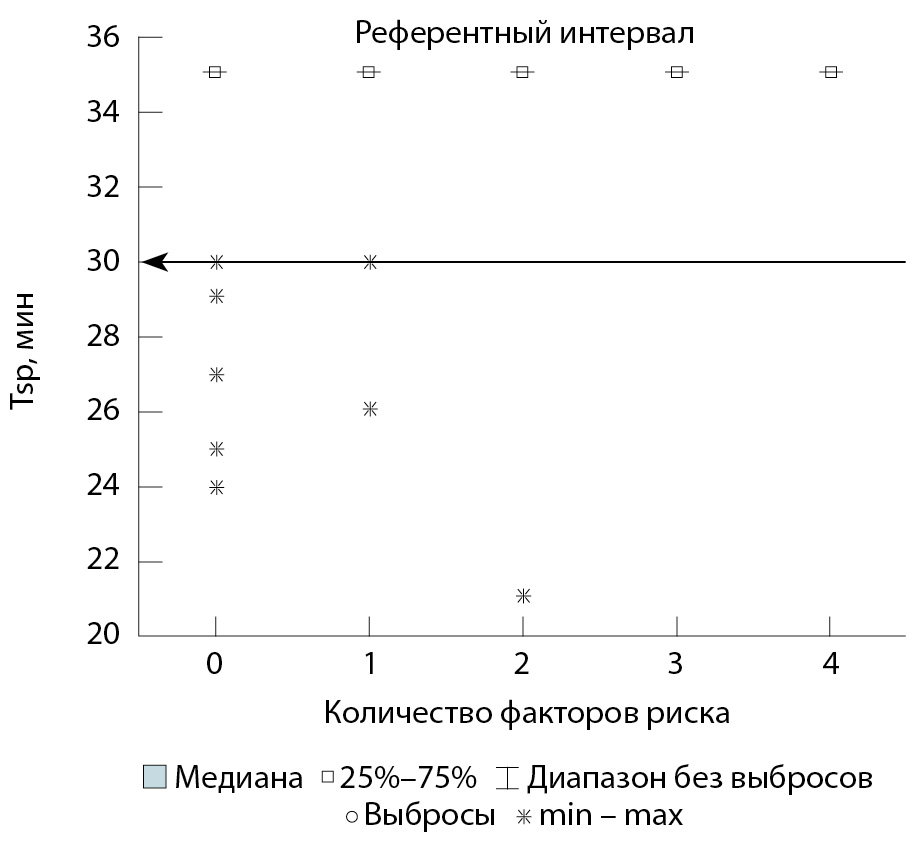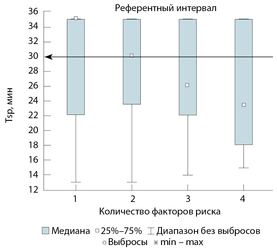 Tsp > 30 мин – спонтанное тромбообразование отсутствует (для параметра Tsp приведены значения n)