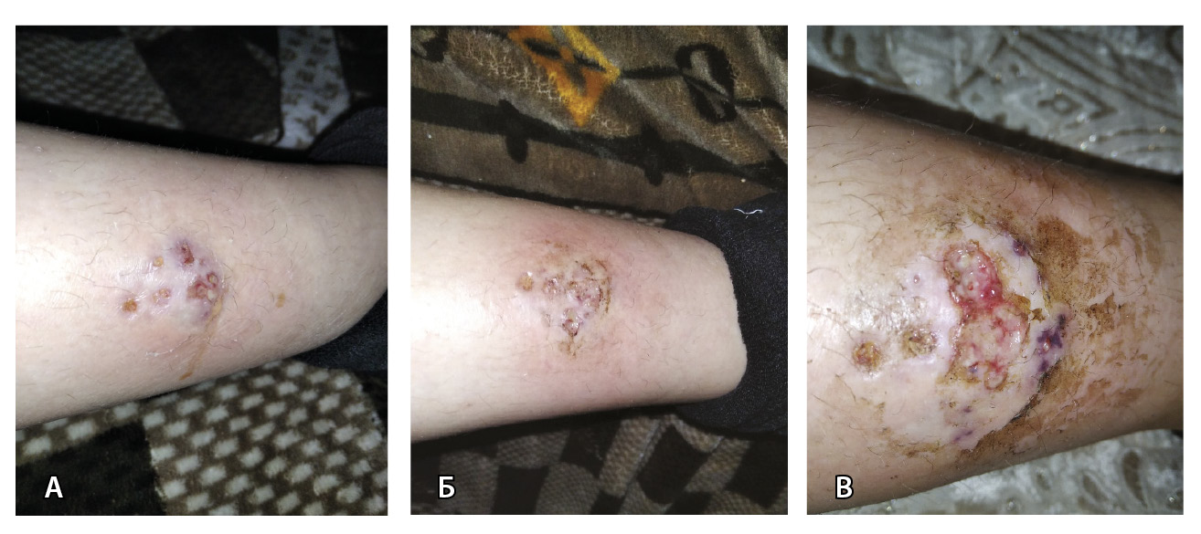 Рис. 1. Динамика развития гнойной раны правой голени: А – 1 октября 2021 г.; Б – 3 октября 2021 г.; В – 5 октября 2021 г.