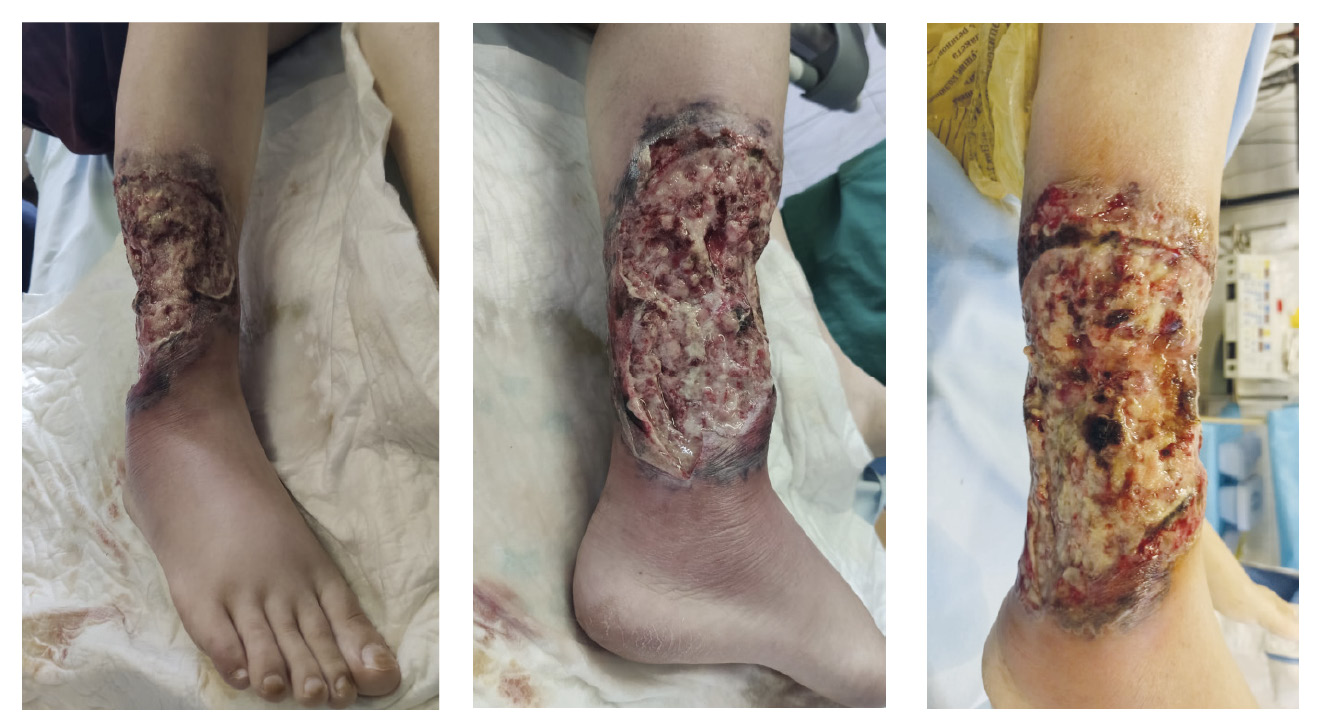 При поступлении сбор жалоб и анамнеза затруднены из-за выраженного болевого синдрома в области правой голени. При осмотре правой голени (рис. 2) по передненаружной поверхности в средней трети определяется рана размерами 18 см по продольной оси и 21 см по поперечной оси конечности. Края раны подрыты, представлены кожным покровом с некротическими изменениями: синюшны, без тургора, без чувствительности. Ширина кожного края с сомнительной жизнеспособностью – 1–1,5 см, что соответствует глубине карманов. Дно раны – гнойно-некротические ткани с обильными отложениями фибрина и участками влажного некроза, грануляционная ткань выражена плохо, темно-красная. Отделяемое скудное, гнойное. Манипуляции в ране крайне болезненны. Выполнен туалет раны, обработка антисептиком, повязка с гелем (0,1% ундециленовый амидопропил-бетаин; 0,1% полиаминопропила бигуанид (полигексанид)).