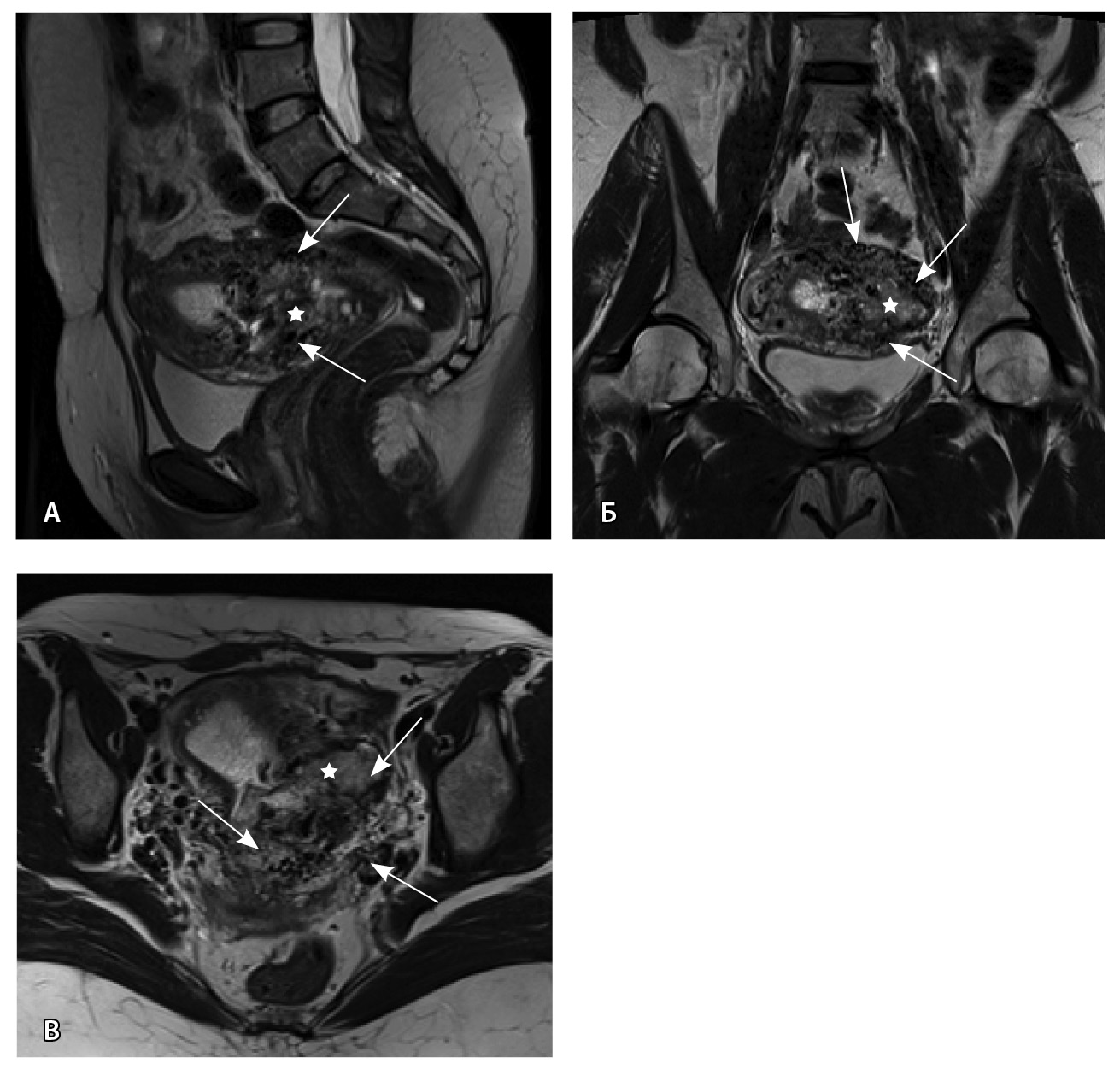 Рис. 1. Остатки вросшего хориона в несостоятельный рубец от кесарева сечения. Магнитно-резонансная томограмма, Т2-взвешенное изображение в сагиттальной (А), корональной (Б), аксиальной (В) плоскостях. Признаки наличия в проекции несостоятельного рубца от кесарева сечения фрагментов ткани вросшего хориона изоинтенсивного сигнала (отмечен звездочкой), с распространением до серозного покрова матки. Стрелками указаны гипоинтенсивные сосуды, зоны неоангиогенеза, артериовенозные сосудистые коллатерали