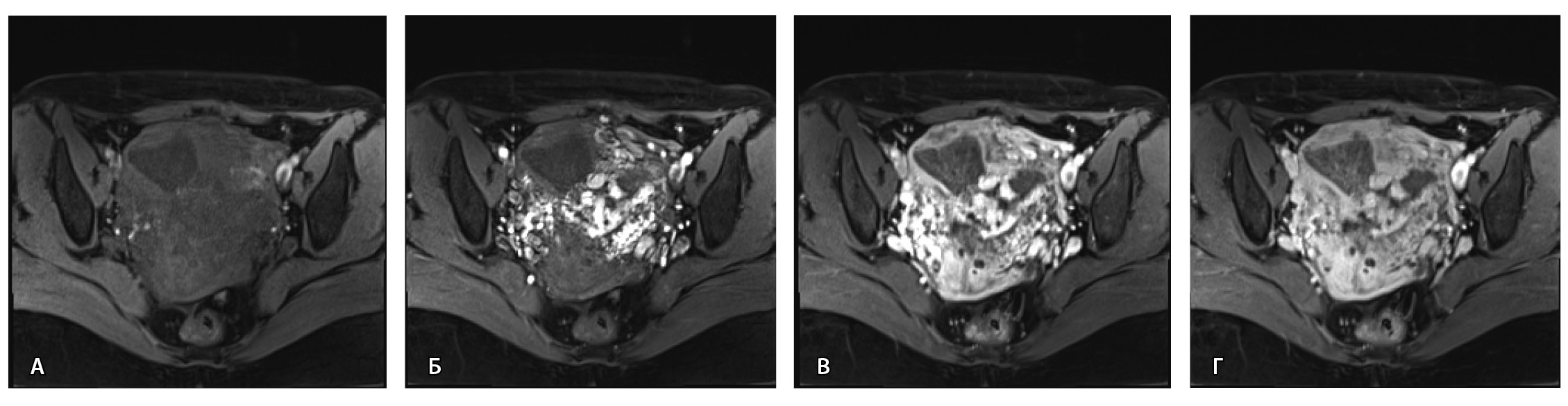 Рис. 2. Магнитно-резонансная томограмма, динамическое контрастное усиление в режиме Т1-взвешенного изображения FS. До контраста (А), в раннюю артериальную фазу (Б), паренхиматозную фазу (В), выделительную фазу (Г) определяются многочисленные патологические сосуды, зоны неоангиогенеза, сосудистые шунты как в стенке матки, так и в параметрии по типу артериовенозной мальформации