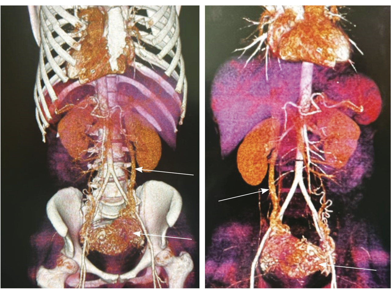 Для детализации сосудистого компонента артериовенозной мальформации, в том числе с целью планирования дальнейшей лечебной тактики, пациентке выполнено КТ-исследование (рис. 3). Обнаружено: тело матки увеличено, определяется образование в полости матки неясного генеза. В стенках матки сосудистая артериальная сеть с ранним сбросом контрастного вещества во внутреннюю подвздошную вену с двух сторон (диаметром 0,7 см справа, 0,8 см – слева), правую яичниковую вену (диаметром до 1,2 см), левую яичниковую вену (диаметром до 0,6 см).