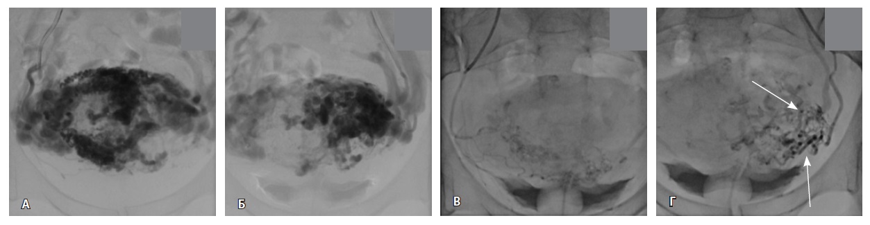 Рис. 4. Данные рентгеноконтрастной ангиографии. А, Б – ангиограммы бассейнов правой и левой маточных артерий. Зоны патологической васкуляризации в проекции тела матки: массивная сеть измененных артерий и вен, ранний артериовенозный сброс в вены параметрия, внутренние подвздошные вены и яичниковые вены с обеих сторон. В, Г – ангиограммы бассейнов правой и левой цервиковагинальных артерий. Контрастирование зоны патологической васкуляризации в проекции шейки и нижнего отдела тела матки, ранний артериовенозный сброс в вены параметрия преимущественно слева и в левую внутреннюю подвздошную вену (стрелки)