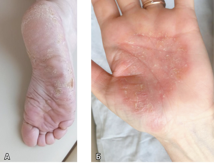 В январе 2021 г. после перенесенной острой респираторной вирусной инфекции больная отметила обострение псориаза в виде увеличения в размере высыпаний на коже ладоней, а также впервые появившихся высыпаний на коже стоп, которые сопровождались шелушением и зудом. По поводу обострения заболевания была госпитализирована в дерматовенерологический стационар. Получала лечение гепатопротекторами, антигистаминными препаратами и топическими глюкокортикостероидами без выраженной клинической динамики.