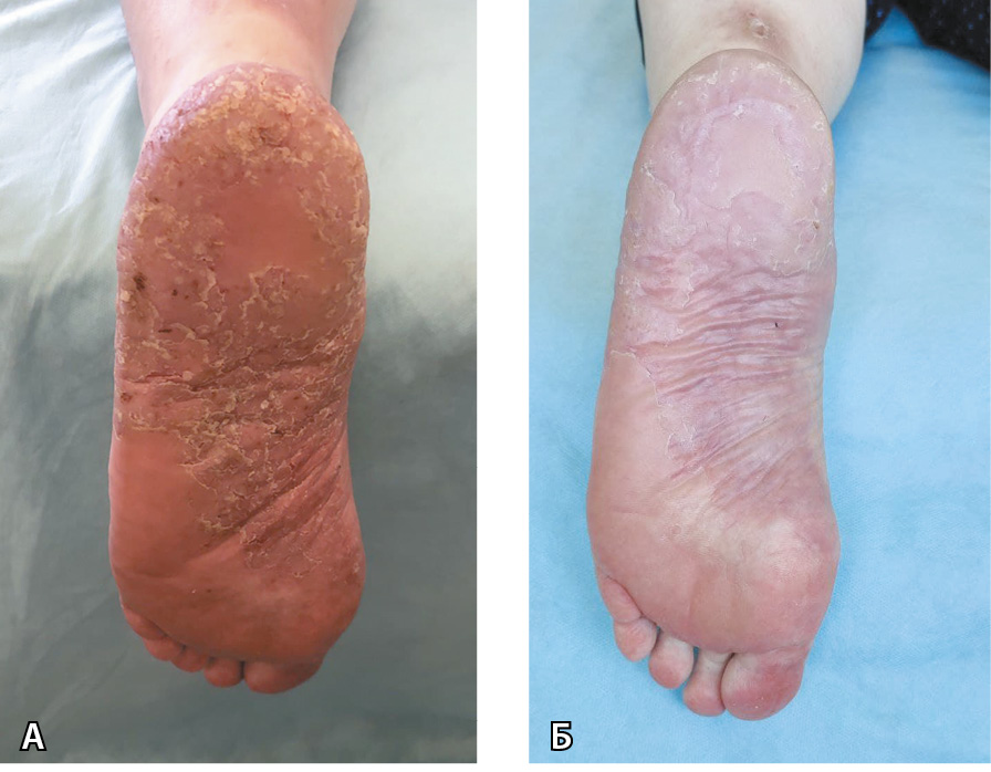 Рис. 4. Больная М.: А – до лечения: выраженный инфильтративный очаг на подошвенной поверхности стопы с гиперкератозом и мелкими пустулами; Б – после 20-го сеанса фототерапии UVB 311 нм сохраняется очаг инфильтрации в центральной зоне подошвы, по периферии очага – застойная эритема, гиперкератоз и пустулы полностью разрешились