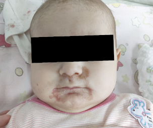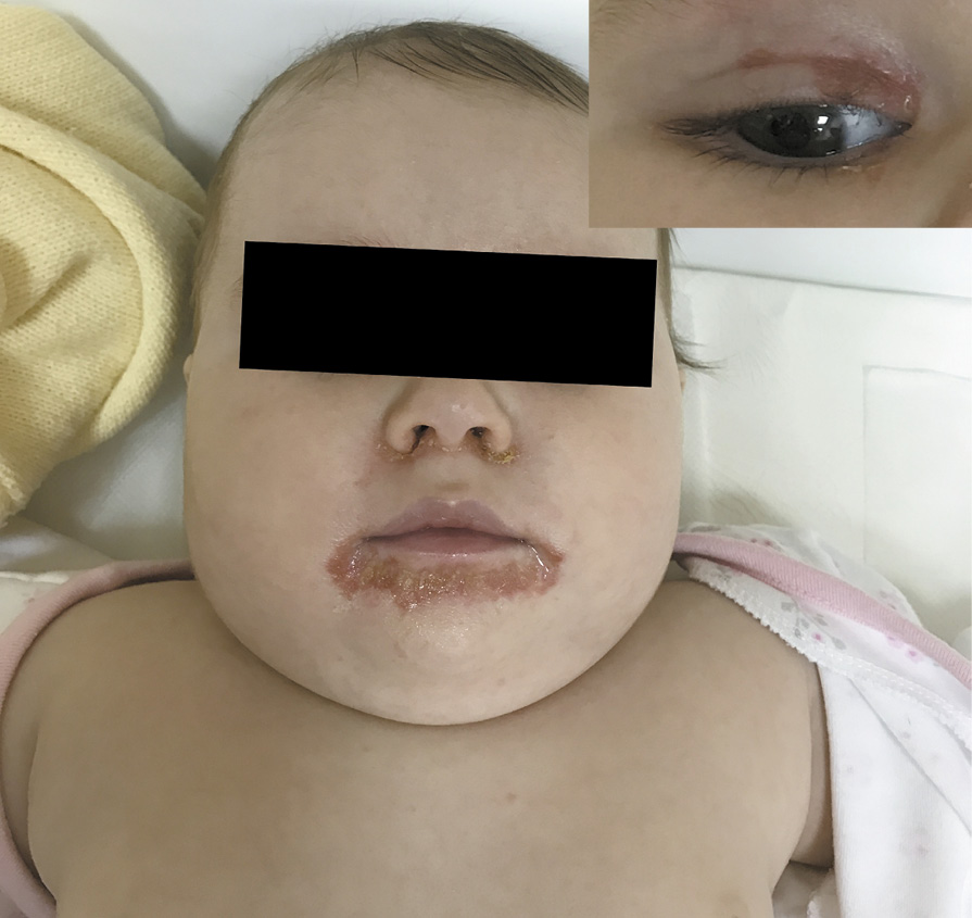 Рис. 1. Пациентка У., 4 мес. Эрозивно-десквамативные очаги неправильной формы, с четкими границами, с серозными гнойными корочками на поверхности, локализующиеся на лице вокруг естественных отверстий