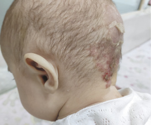 Рис. 2. Пациентка У., 4 мес. Умеренно инфильтрированное пятно ярко-красного цвета, покрытое серозно-геморрагическими корками, локализующееся на коже в затылочной области