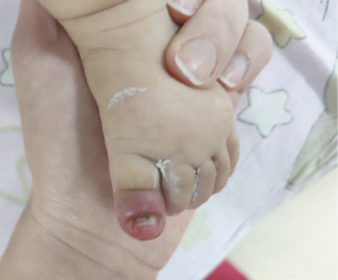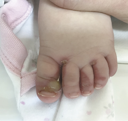 Рис. 4. Пациентка У., 4 мес. Деформация ногтевой пластинки и паронихия I пальца левой стопы