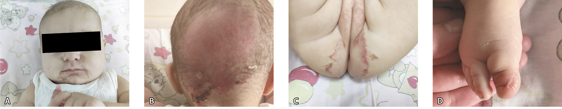 Кожные покровы розовые, цианоза нет, лицо и уши гиперемированы с обильным шелушением. Отмечалась незначительная пастозность мягких тканей, умеренно выраженный мраморный рисунок. На коже периоральной зоны, ушных раковин, верхнего века правого глаза, в области крыльев носа, кистей и стоп отмечались множественные эрозивно-десквамативные очаги неправильной формы, с четкими границами, с серозными гнойными корочками на поверхности (рис. 1). На коже в затылочной области определялось умеренно инфильтрированное пятно ярко-красного цвета, покрытое серозно-геморрагическими корками (рис. 2). На коже аногенитальной области были обширные эрозии с яркой гиперемией, серозными корками и обрывками эпидермиса по краевой зоне очагов поражения (рис. 3). Отмечалась деформация ногтевых пластинок и паронихия I пальцев стоп (рис. 4).