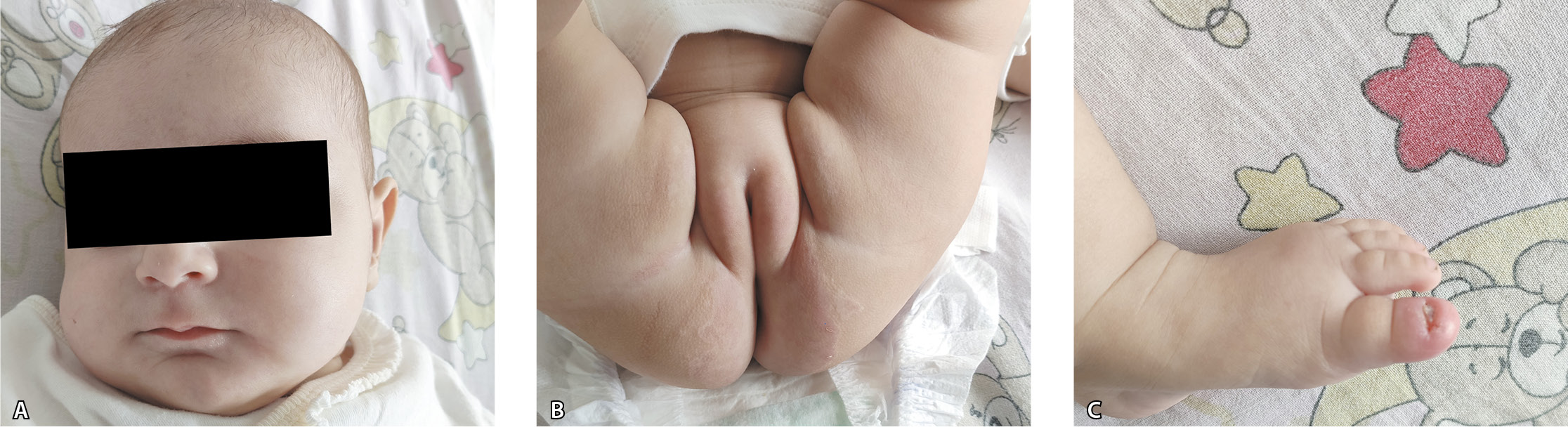 Анамнез заболевания. Со слов матери, в возрасте 3 месяцев, после неполного завершения периода грудного вскармливания, у девочки появились одиночные высыпания на коже вокруг естественных отверстий (ротовой полости, ушных раковин, в области промежности), сопровождавшиеся умеренным зудом. В течение последующего времени было отмечено увеличение количества и площади высыпаний, появление эрозий, кровоточивости, изменение ногтевой пластинки I пальца правой стопы. Эпизодически возникала диарея с признаками мальабсорбции. Родители обратились в поликлинику по месту жительства (республика Дагестан), где был установлен диагноз атопического дерматита, рекомендовано использование антибактериальной мази (комбинированный препарат бацитрацина и неомицина), топического глюкокортикостероидного крема (бетаметазон). Терапия, проводимая в течение 2 недель, не имела эффекта, зарегистрировано распространение высыпаний на кожу дистальных фаланг пальцев кистей и стоп. Учитывая отсутствие динамики на фоне проводимой терапии, родители самостоятельно обратились в ГБУЗ «Детская городская поликлиника № 94» ДЗМ. Педиатр заподозрил у ребенка энтеропатический акродерматит в связи с наличием схожей симптоматики у старшей сестры и направил в 1-е неонатологическое отделение ДГКБ им. З.А. Башляевой на обследование и лечение.