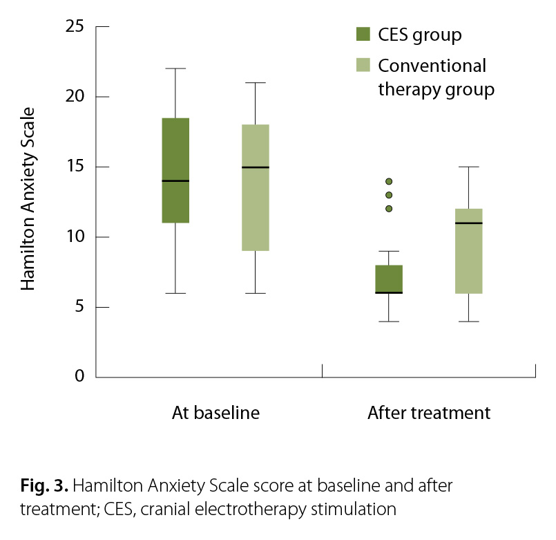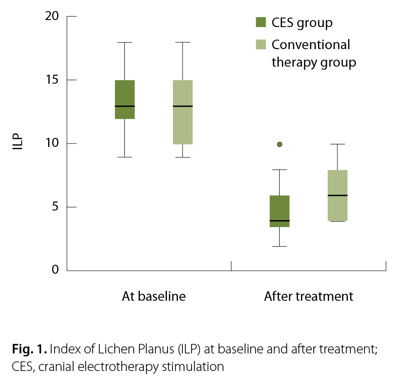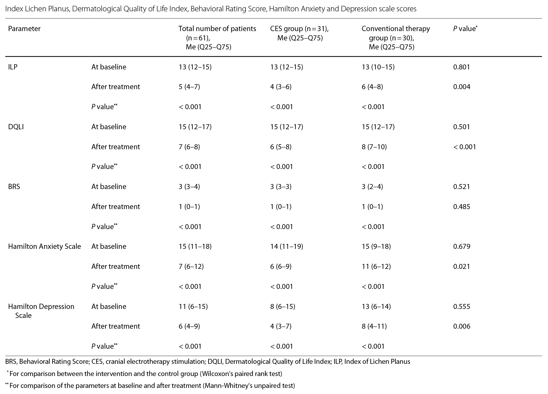 Materials and methods: This was an open label, prospective, comparative study in 61 patients with common typical form of lichen ruber planus (39 (63%) women and 22 (37%) men) aged 18 to 74 years (mean age 41 ± 14.29 years). The duration of the disease was 11.88 ± 10.15 months (range, 1 to 42 months). The patients were adaptively randomized into two groups of similar gender distribution, age, and disease duration. The patients in the comparison group (n = 30) were treated conventionally in accordance with the Federal Clinical Guidelines (chloroquine, hydroxyzine, topical corticosteroids). The main group (n = 31) was administered similar therapy; however, instead of hydroxyzine, CES was performed. The duration of in-patient treatment in both groups was 14 days, with the follow-up lasting for up to 3 months. The results of treatment were assessed by dynamics of pathological changes of the skin (Index of Lichen Planus, ILP), impact of dermatosis on various domains of the patient’s life (Dermatology Life Quality Index, DLQI), changes in psychological status (Hamilton Anxiety Scale and Hamilton Depression Scale). In addition, the impact of pruritus on the patients' daily activities was assessed by Behavioral Rating Scores questionnaire (BRS).