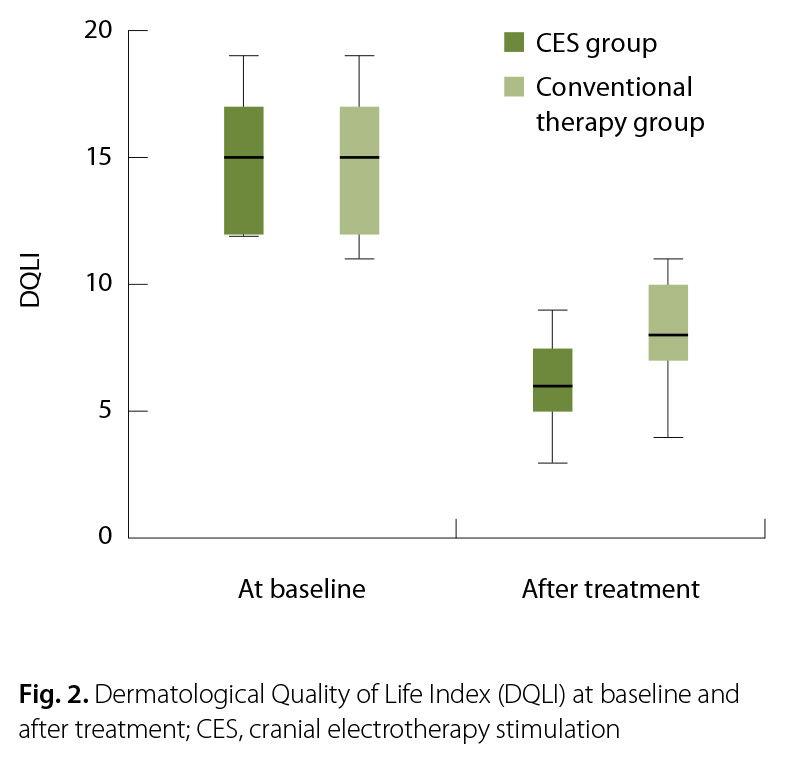 Results: At baseline, there were no significant differences between the groups in ILP (p = 0.801), DLQI (p = 0.501), BRS (p = 0.521), Hamilton Anxiety Scale (p = 0.301), and Hamilton Depression Scale (p = 0.493). At the end of treatment, ILP in the CES group decreased 3.25-fold (p < 0.001), whereas in the group treated with conventional therapy the decrease was 2.1-fold (p < 0.001); DLQI decreased 2.5-fold (p < 0.001) and 1.8-fold (p < 0.001), respectively. The corresponding decreases of Hamilton Anxiety Scale in the treatment groups were 2.3-fold and 1.3-fold, respectively, and those in Hamilton Depression Scale – 2-fold and 1.6-fold, respectively (all p < 0.001). In addition, statistically significant intergroup differences were found for ILP (p = 0.04), DQLI (p < 0.001), Hamilton Anxiety and Depression scale scores (p = 0.021 and p = 0.006, respectively). As for the BRS changes, in both groups there was an equally significant (p < 0.001) decrease, but the intergroup differences were not statistically significant (p = 0.485).