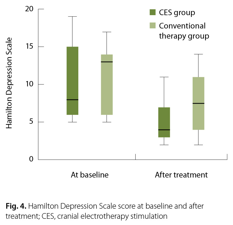 При опросе всех обследуемых по шкалам тревоги и депрессии Гамильтона тревога была выявлена у 49 (80,3%), а депрессия – у 43 (70,5%) пациентов. Медиана балла по шкалам тревоги и депрессии Гамильтона у пациентов до терапии в обеих группах соответствовала умеренным проявлениям тревоги и депрессии и статистически не различалась (p = 0,301 и p = 0,493 соответственно). На фоне лечения в основной группе отмечен более отчетливый благоприятный эффект – уменьшение проявления как тревоги в 2,3 раза (p < 0,001), так и депрессии в 2 раза (p < 0,001) по отношению к группе сравнения (p = 0,0021 и p = 0,006 соответственно), где тревога снизилась в 1,3 раза (p < 0,001), а депрессия – в 1,6 раза (p < 0,001) (см. таблицу; рис. 3, 4).