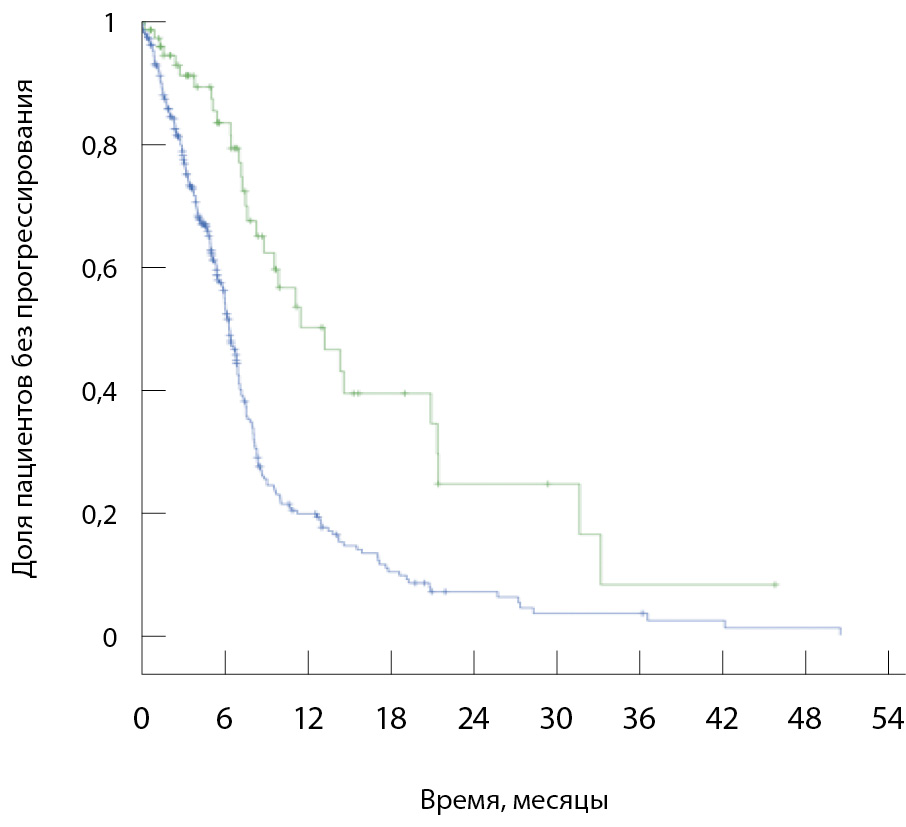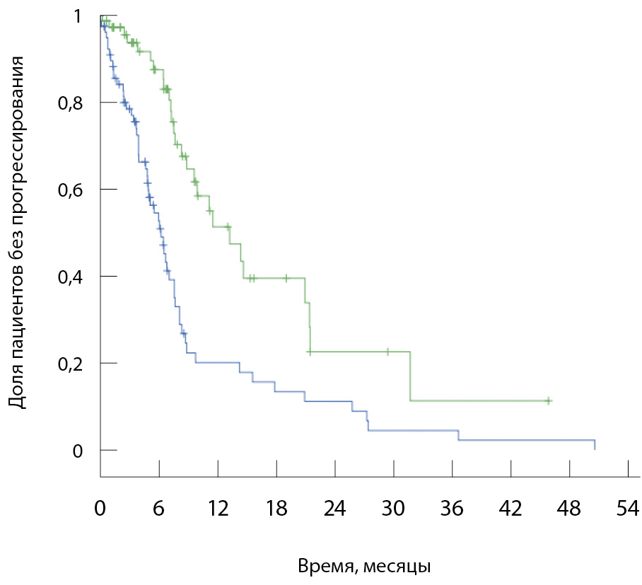 Рис. 4. Моделирование медианы времени до прогрессирования методом Каплана – Мейера для больных с ECOG 0–1 после проведения процедуры псевдорандомизации (log-rank р < 0,000). Синяя кривая – группа лечения в рамках обязательного медицинского страхования, зеленая – группа клинических исследований