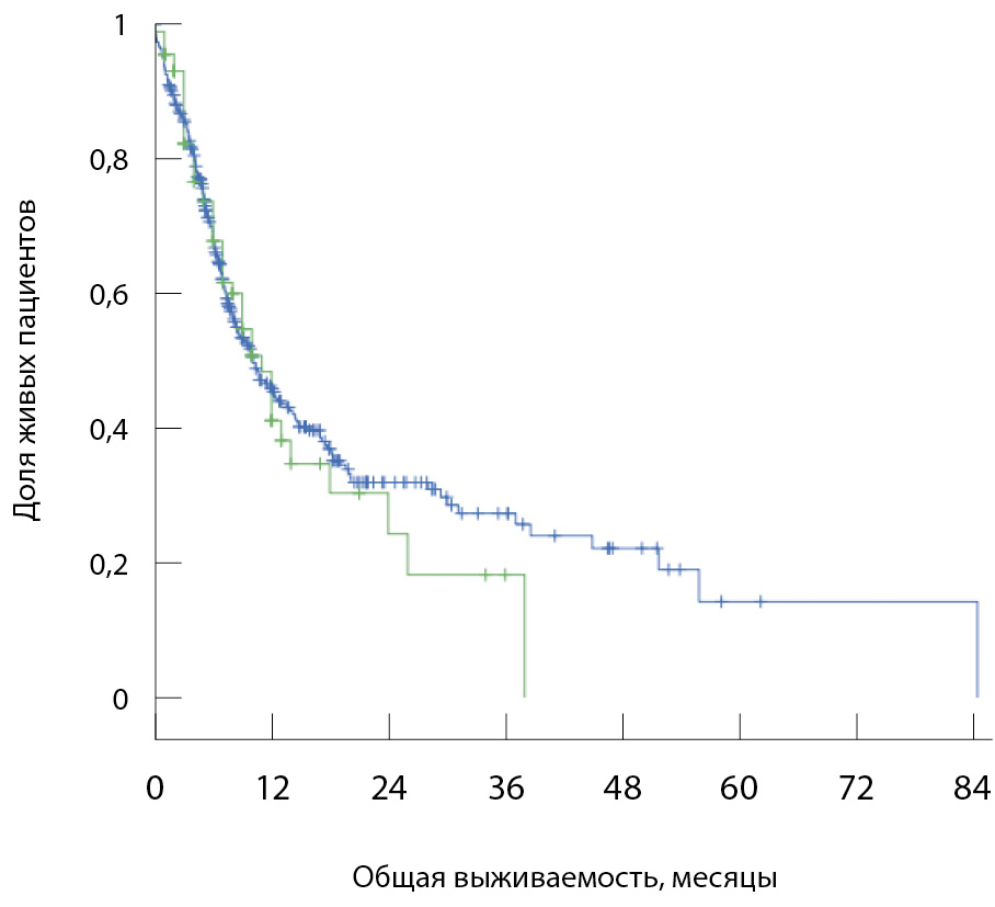 Рис. 2. Моделирование общей выживаемости методом Каплана – Мейера. Синяя кривая – группа лечения в рамках обязательного медицинского страхования, зеленая – группа клинических исследований