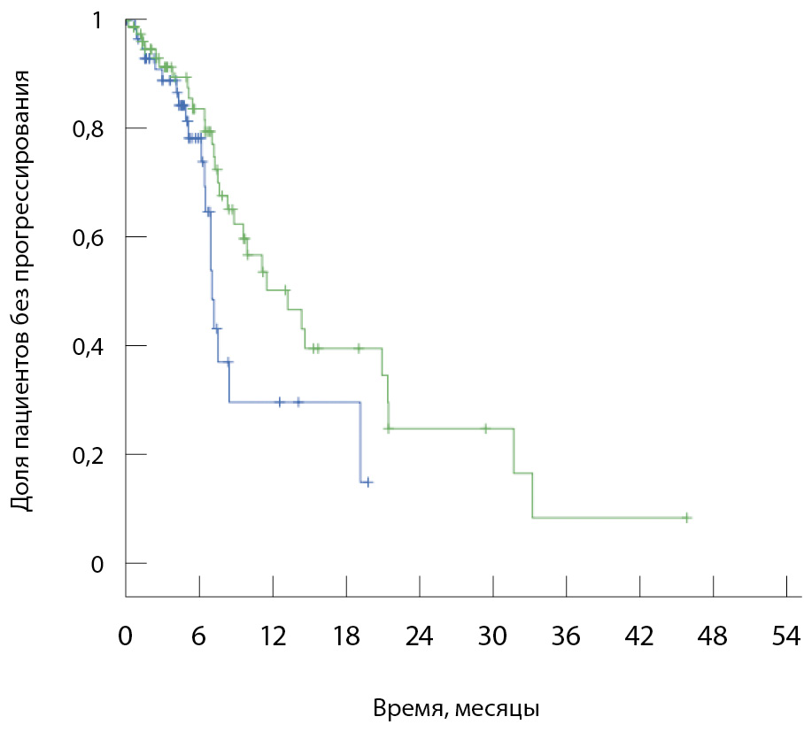 Рис. 3. Моделирование медианы времени до прогрессирования методом Каплана – Мейера для больных с ECOG 0–1 (р = 0,039). Синяя кривая – группа лечения в рамках обязательного медицинского страхования, зеленая – группа клинических исследований