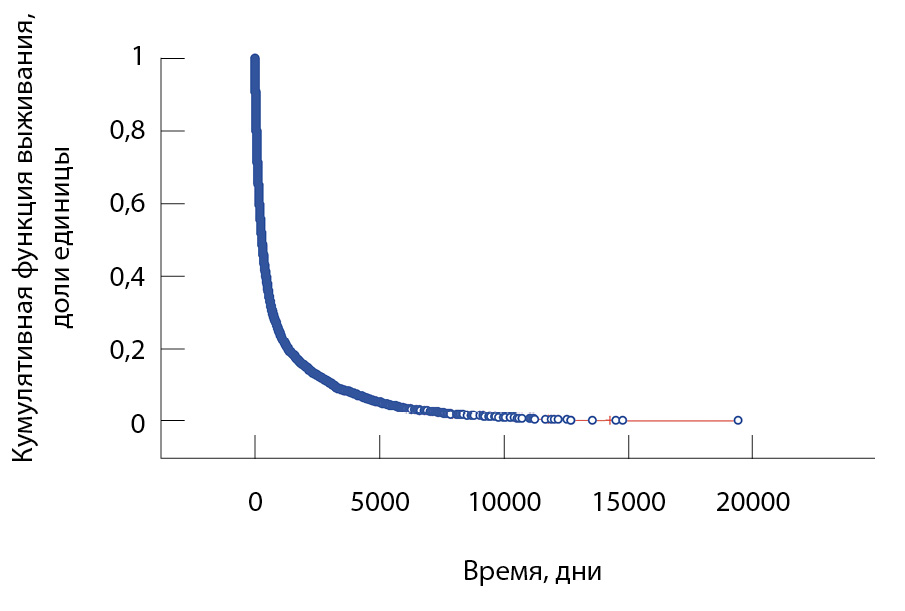 Рис. 1. Общая функция выживания при немелкоклеточном раке легкого. Анализ Каплана – Мейера: переменная – количество дней, переменная с индикатором цензуры – цензура; общее количество наблюдений – 6056, достоверных наблюдений – 6010; без цензурирования – 5703 (94,89%), цензурированные – 307 (5,11%)