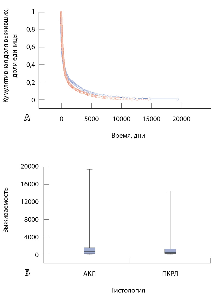 Рис. 2. Общая функция выживания в зависимости от гистологического типа немелкоклеточного рака легкого: А – графики функции выживания (анализ Каплана – Мейера), Б – коробчатые диаграммы (медиана, 25-й и 75-й перцентили, размах); АКЛ – аденокарцинома легкого, ПКРЛ – плоскоклеточный рак легкого