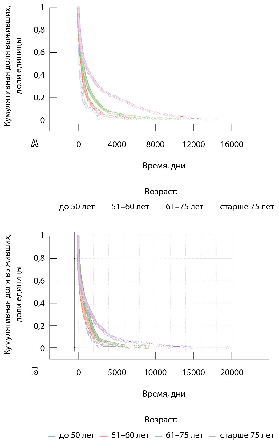 Рис. 3. Общая функция выживания в зависимости от возраста: А – при плоскоклеточном раке легкого (данные анализа Каплана – Мейера: общее количество наблюдений – 3007; переменная – количество дней, вычисленное на основе цензурируемых наблюдений; группирующая переменная – возраст; количество достоверных наблюдений – 3006; без цензурирования – 2923 (99,97%); подвергнуто цензурированию – 83 (2,76%); тестовая статистика хи-квадрат = 86,67243, df = 3, p = 0,000001); Б – при аденокарциноме легкого (данные анализа Каплана – Мейера: общее количество наблюдений – 3049; переменная – количество дней, вычисленное на основе цензурируемых наблюдений; группирующая переменная – стадия; количество достоверных наблюдений – 3004; без цензурирования – 2780 (92,54%); подвергнуто цензурированию – 224 (7,46%); тестовая статистика хи-квадрат = 24,15292, df = 3, p = 0,00002)