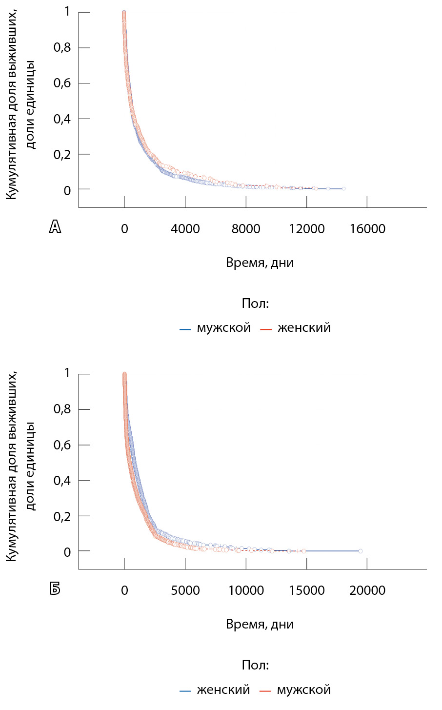 Рис. 4. Общая функция выживания в зависимости от пола: А – при плоскоклеточном раке легкого (данные анализа Каплана – Мейера: общее количество наблюдений – 3007; переменная – количество дней, вычисленное на основе цензурируемых наблюдений; группирующая переменная – возраст; количество достоверных наблюдений – 3006; без цензурирования – 2923 (99,97%); подвергнуто цензурированию – 83 (2,76%); тестовая статистика Z = 0,0098290, p = 0,99216. Влияние фактора «пол» не значимо); Б – при аденокарциноме легкого (данные анализа Каплана – Мейера: общее количество наблюдений – 3049; переменная – количество дней, вычисленное на основе цензурируемых наблюдений; группирующая переменная – стадия; количество достоверных наблюдений – 3004; без цензурирования – 2780 (92,54%); подвергнуто цензурированию – 224 (7,46%); тестовая статистика Z = 7,57835, p = 0,00000)