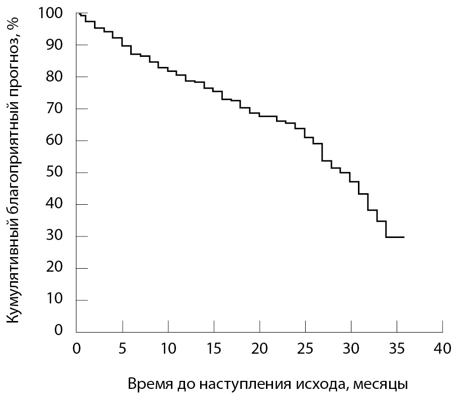 В исследовании была проанализирована комбинированная конечная точка (ККТ), объединившая произошедшие после индексного события смертельные исходы, нефатальные ИМ и МИ. При анализе ККТ больные были также разделены на 2 группы: группа 1 – пациенты, достигшие ККТ (n1 = 103), группа 2 – пациенты, не достигшие ККТ (n2 = 150). Медиана возраста в группе 1 составила 75,0 [67, 0; 81, 0] года, в группе 2 – 65,0 [50, 0; 82, 0] года (p < 0,001). Мужчин в группе 1 было 48,5% (n = 50), в группе 2 – 61,3% (n = 92) (p = 0,045). Данные о кумулятивном благоприятном прогнозе представлены на рис. 2.