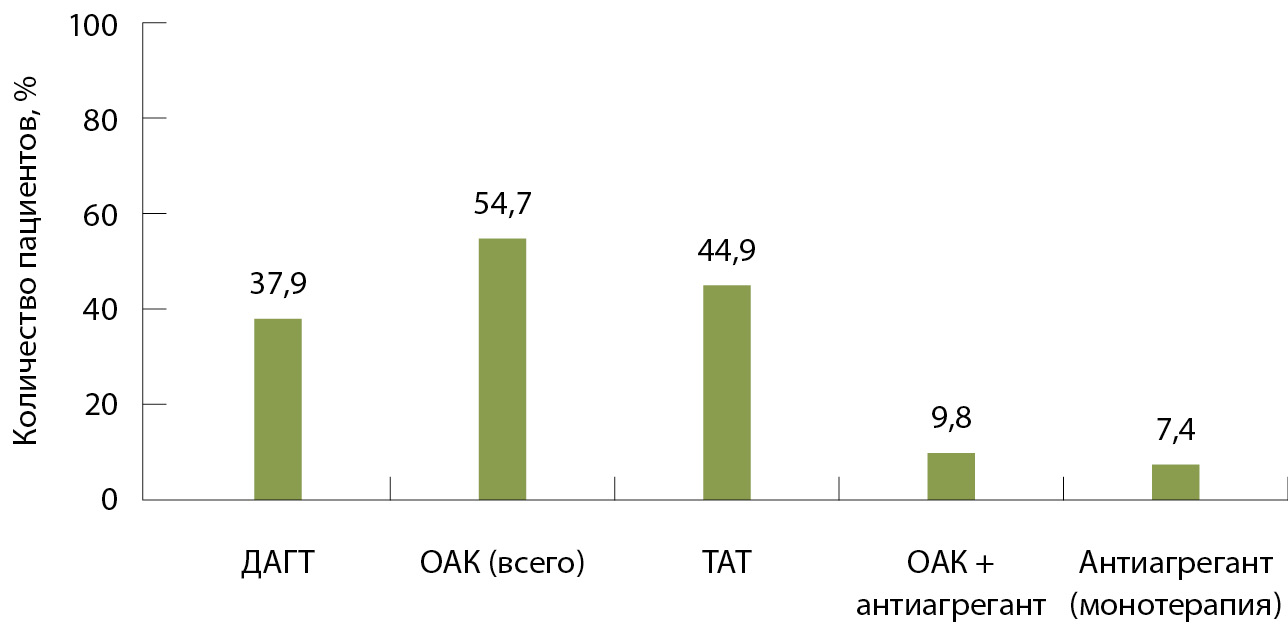 Рис. 3. Профиль назначаемой антитромботической терапии (n = 256); ДАГТ – двойная антиагрегантная терапия, ОАК – оральный антикоагулянт, ТАТ – тройная антитромботическая терапия
