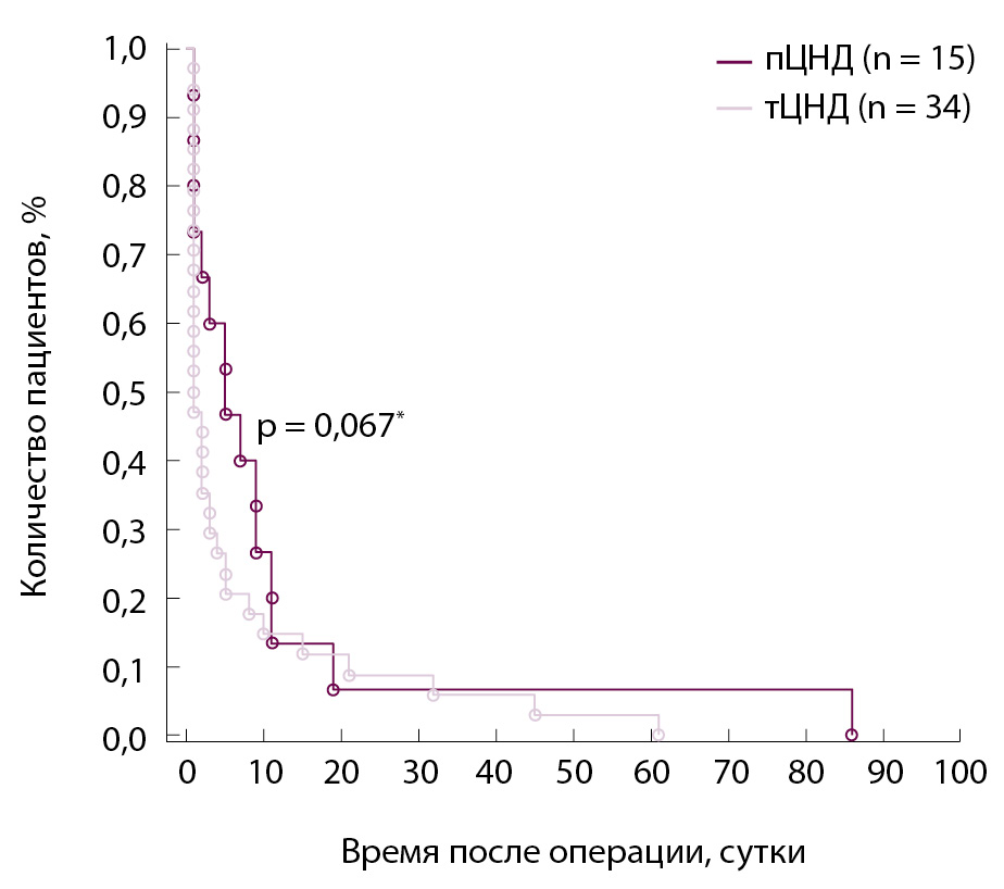 Рис. 1. Сроки развития постоянного (пЦНД) и транзиторного центрального несахарного диабета (тЦНД) после трансназальной аденомэктомии; * тест Гехана – Уилкоксона
