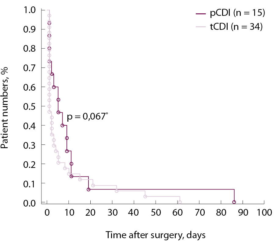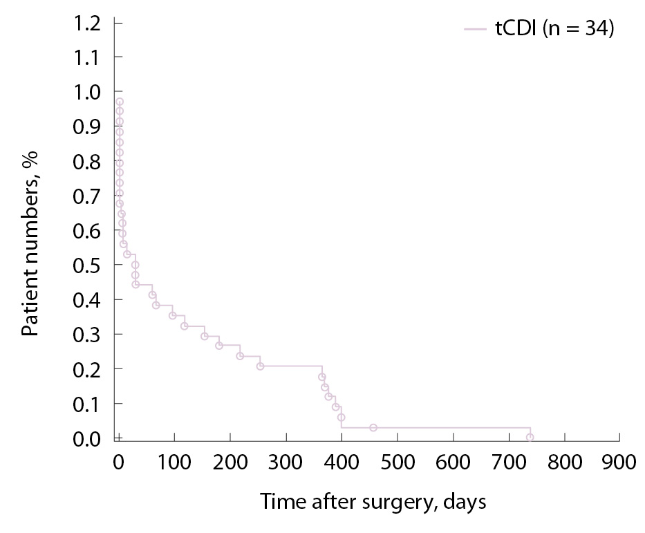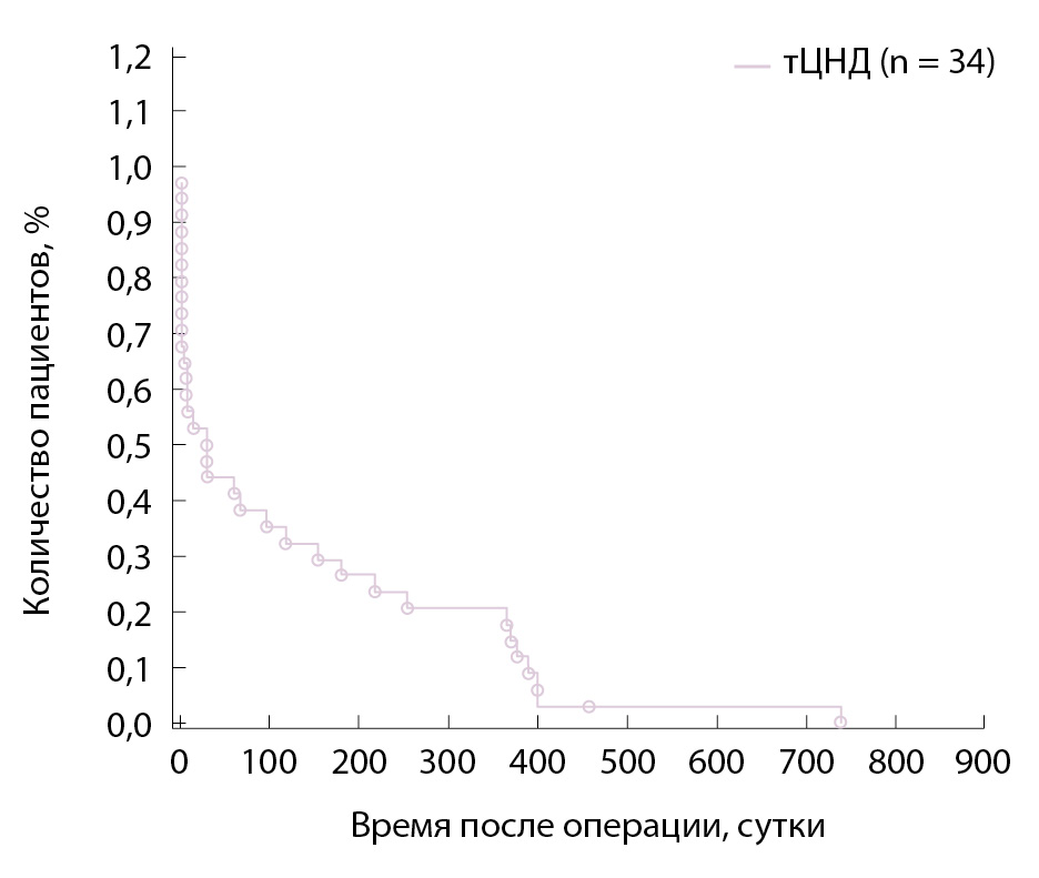 Развитие нарушений у пациентов с пЦНД приходилось на 5-е сутки [1; 9, 5] и статистически значимо не отличалось по срокам от пациентов с тЦНД – 1-е сутки [1; 4, 5] послеоперационного периода (p = 0,067, тест Гехана – Уилкоксона) (рис. 1). Максимальный срок развития пЦНД – 86-е сутки, тЦНД – 61-е сутки после вмешательства. Разрешение нарушений у пациентов с тЦНД приходилось на 30-е сутки [1, 5; 199] послеоперационного периода, максимальный срок разрешения – 738-е сутки после операции. При этом наступление ремиссии заболевания установлено более чем через год после вмешательства у 7 пациентов (21%; 95% ДИ 10–37), этот срок составил более полутора лет у 4 пациентов (12%; 95% ДИ 4–27) (рис. 2).