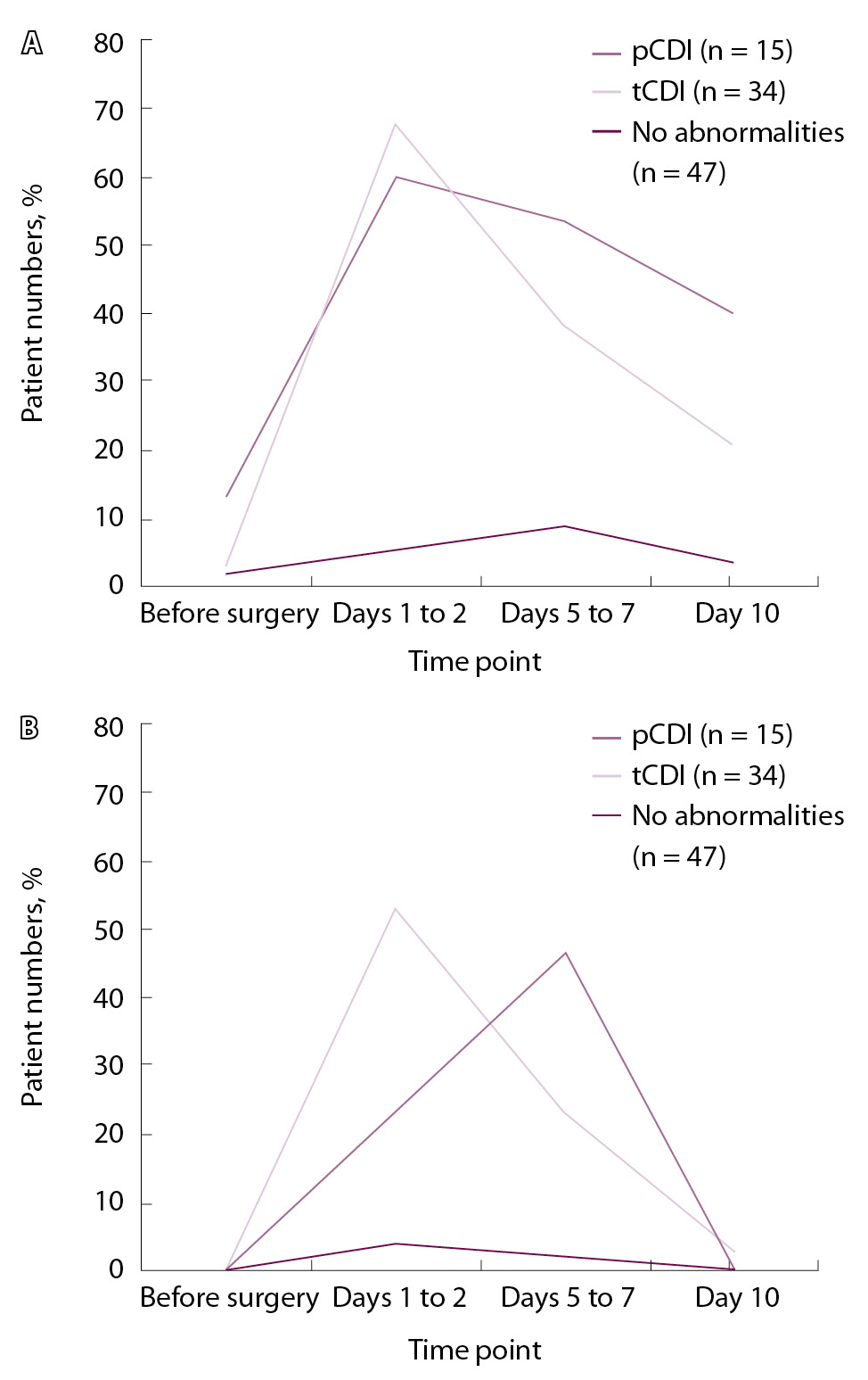 Половина случаев водно-электролитных нарушений возникает в первые 5 суток оперативного вмешательства. Дебют ЦНД в 1-е сутки после операции более характерен для транзиторных нарушений, которые разрешаются в процессе дальнейшего наблюдения, а дебют ЦНД на 5-е сутки после операции чаще отмечается при постоянной форме заболевания.