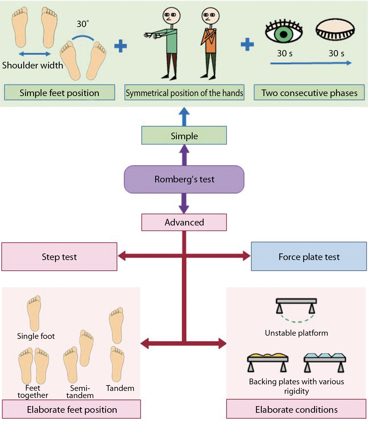 Многочисленные варианты пробы Ромберга условно можно разделить на две группы: простые и усложненные (или модифицированные, в английском эквиваленте – modified/sharpened). Простая проба Ромберга представляет собой спокойное стояние на неподвижной платформе в течение 1 минуты (первые 30 секунд человек стоит с открытыми глазами, затем закрывает их), при этом стопы и руки находятся в одном из стандартных положений. Модифицированная проба является дополненной простой. Чаще всего такую модификацию можно свести к двум направлениям. Первое предполагает использование усложненных позиций стоп на протяжении всего исследования либо чередование разных позиций [33]. Другое направление – изменение поверхности, на которой стоит испытуемый. Например, применение нестабильных платформ, подкладок различной жесткости, специальных подушек [34]. Назначение таких проб – дифференцированная оценка стабильности вертикальной позы без применения специальных измерительных приборов, при которой создаются условия для уменьшения или увеличения влияния проприоцепции [35]. К усложненным можно также отнести шаговую пробу [36]. В другой тип выделяют тесты, проводимые уже с применением силовой платформы [37]. Упрощенная схема распространенных вариантов пробы Ромберга дана на рис. 2.