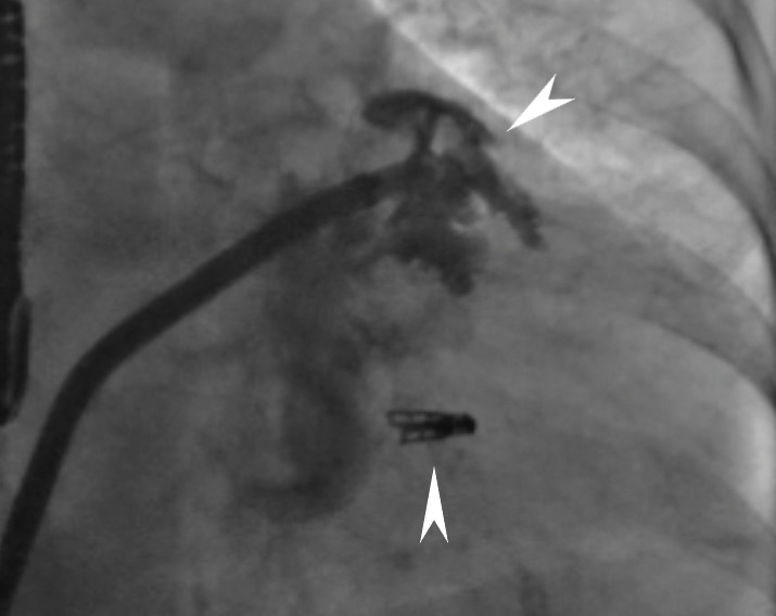 Рис. 1. Рентгенография после клипирования створок митрального клапана клипсой MitraClip. Селективное контрастирование ушка левого предсердия через систему доставки для оценки анатомии (указано стрелками)