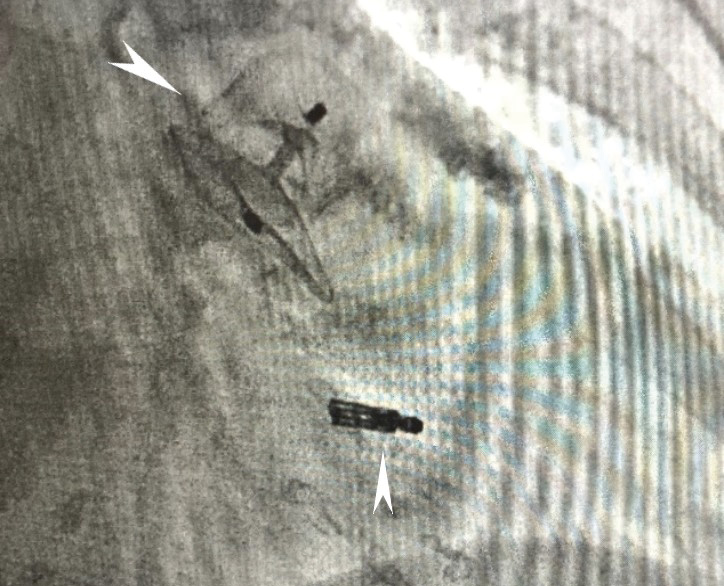 Рис. 2. Рентгенография после установки окклюдера Amulet в ушко левого предсердия. Визуализируется ранее установленная клипса MitraClip (указано стрелками)