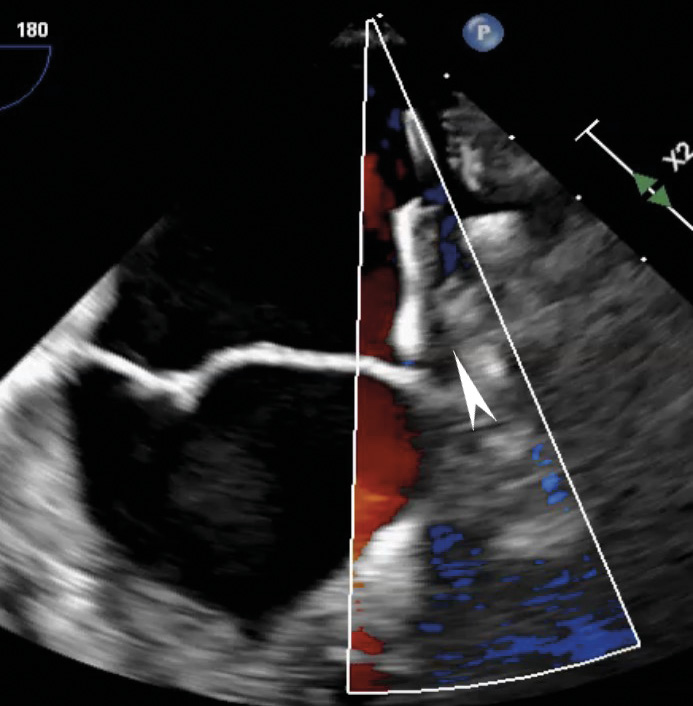 Рис. 4. В режиме цветного доплеровского картирования патологического сброса и краевых потоков в проекции установленного окклюдера в ушке левого предсердия не выявлено (окклюдер указан стрелкой)