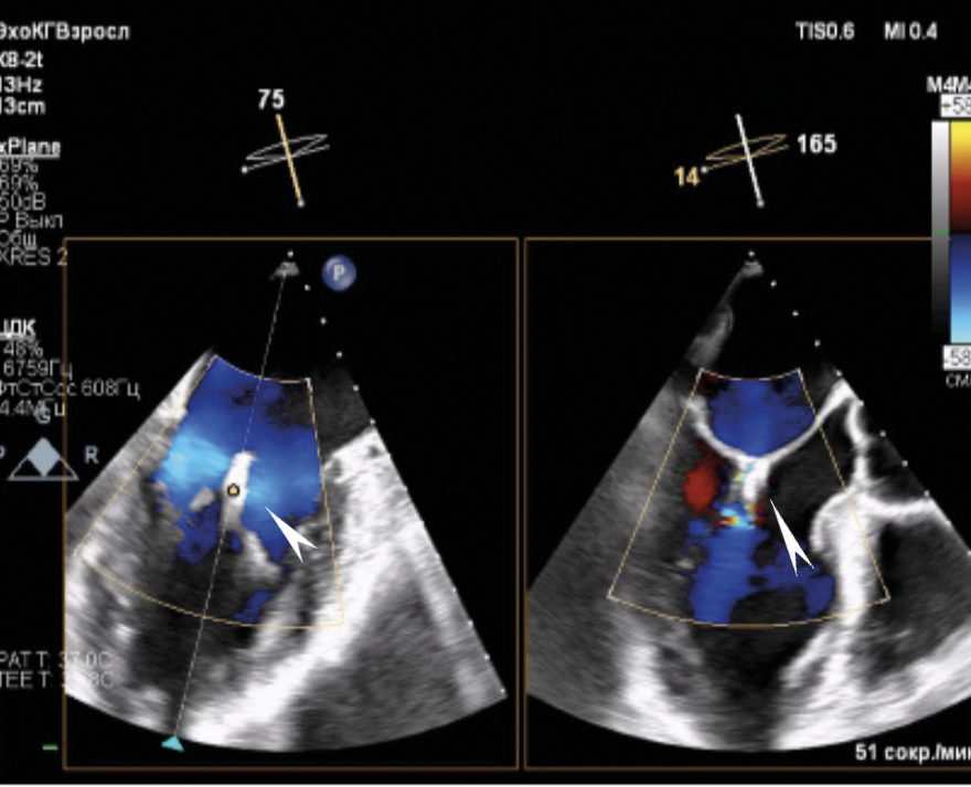 По результатам ЧП ЭхоКГ после вмешательства: в проекции МК визуализируется 1 клипса, митральная регургитация до 1-й степени (площадь струи регургитации 4,5 см2), величина коаптации менее 3 мм. Площадь отверстия МК – 4,7 см2. Кольцо МК = 3,45/3,8 см. Средний диастолический градиент на МК – 2,1 мм рт. ст. Место имплантации клипсы без особенностей. Количество струй регургитации – 1, тип регургитации – эксцентрический, распространяющийся вдоль межпредсердной перегородки. В просвете УЛП визуализируется плотно фиксированный окклюдер. Периферического кровотока по краям окклюдера не выявлено. В месте пункции межпредсердной перегородки визуализируется лево-правый сброс до 3 мм. Данные ЧП ЭхоКГ после вмешательства приведены на рис. 3–5.