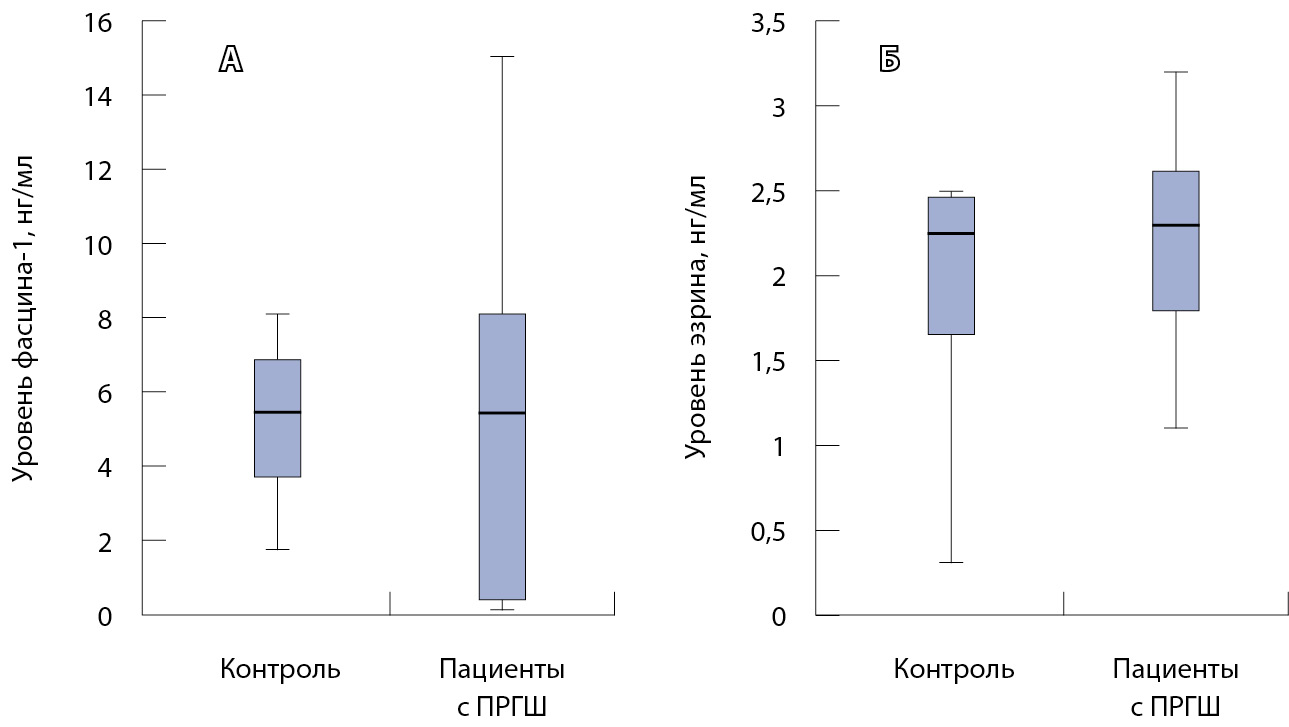 На рис. 1 приведены данные по содержанию актин-связывающих белков фасцина-1 и эзрина в сыворотке крови у больных ПРГШ по сравнению со здоровыми донорами. Значимых различий в уровнях изучаемых белков не наблюдалось, что связано, вероятно, с большим разбросом данных в группе пациентов с ПРГШ.