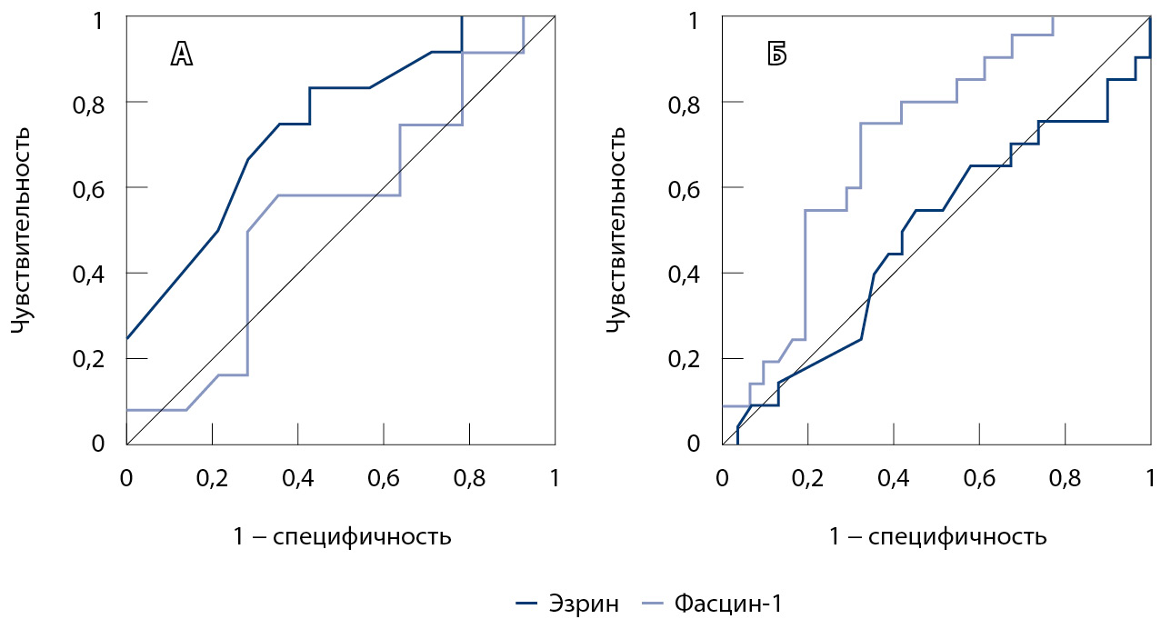 Результаты ROC-анализа, с помощью которого рассчитывали перспективность определения уровней фасцина-1 и эзрина в сыворотке крови для различения больных с метастазами и без них, а также больных с высоким и низким риском развития рецидивов, отражены на рис. 2.