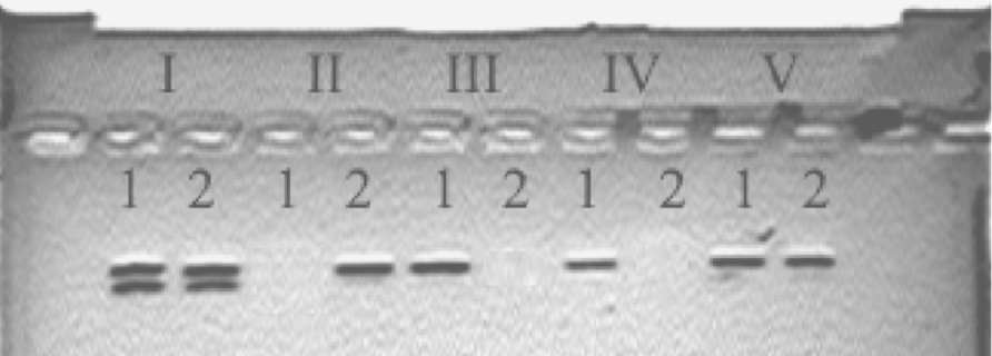 Рис. 1. Фрагмент агарозного геля после электрофоретического разделения продуктов амплификации rs2010963 гена VEGFA: I, II, III, IV, V – номера исследуемых образцов ДНК; 1-я дорожка – фрагменты ДНК, специфичные к аллели G; 2-я дорожка – фрагменты ДНК, специфичные к аллели С. Пример заключения: образцы I и V – генотип GС; образец II – генотип СС; образцы III и IV – генотип GG