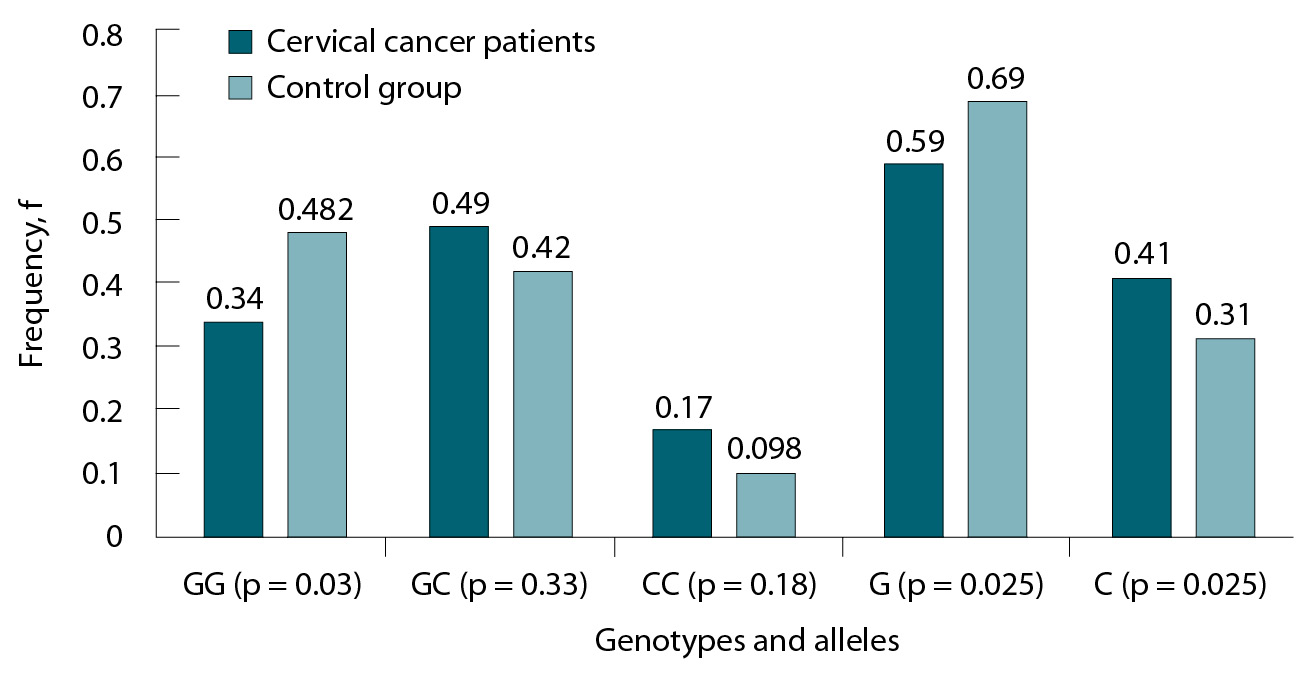 Results: In the patients, cervical cancer has associated with the VEGFA gene allelic polymorphism rs2010963 (χ2 = 5.47; p = 0.021). The minor C allele increased risk of cervical cancer by 1.6-fold (odds ratio (OR) 1.58, 95% confidence interval (CI) 1.08-2.31), and the ancestral G allele reduced the cervical cancer probability (OR 0.63, 95% CI 0.43-0.93). The genotypes distribution in the dominant model (GG and GC + CC) confirmed the association of the rs2010963 VEGFA gene polymorphism with cervical cancer (χ2 = 4.73; p = 0.031), specifically, if there was a minor C allele in the genotype (GC + CC). We found that the association of the rs2010963 VEGFA gene polymorphism with TE in the tumor vessels and surrounding tissues was a predictor of unfavorable progression and metastasis of cervical cancer (χ2 = 3.94; p = 0.049). The minor C allele increased the risk of TE by 1.7-fold (OR 1.72, 95% CI 1.004-2.98), whereas the ancestral G allele reduced this chance (OR 0.58, 95% CI 0.34-0.996).