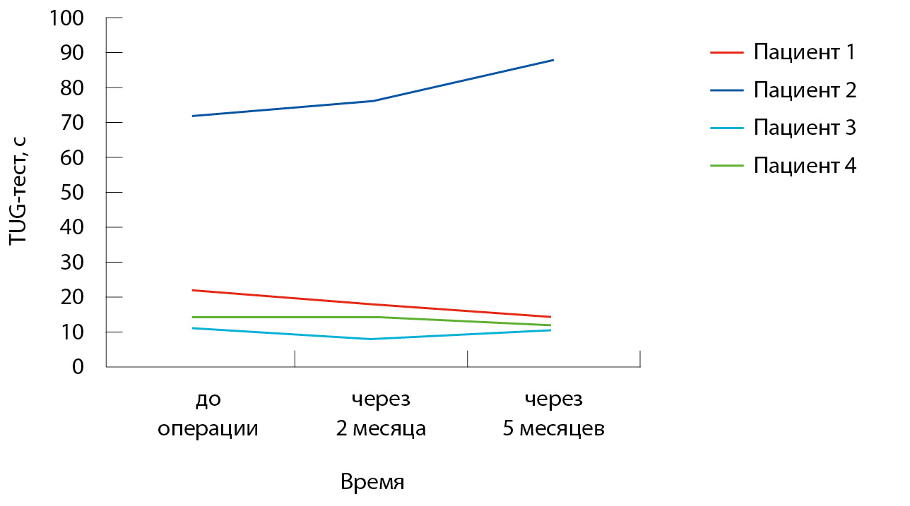 Несмотря на отсутствие четкого тренда на регрессию баллов по шкале MDS-UPDRS; часть III; у 3 из 4 пациентов регистрировали улучшение ходьбы при выполнении TUG-теста (рис. 2) и увеличение скорости прохождения дистанции в 10 метров (рис. 3). Исключение составил пациент 2; имевший исходно существенно более тяжелый функциональный статус. По результатам оценки по опросникам ABC и PDQ-8 на 2-й месяц после хирургического лечения все пациенты отмечали улучшение; однако к 5-му месяцу вновь возникала тенденция к субъективному ухудшению состояния (таблица).