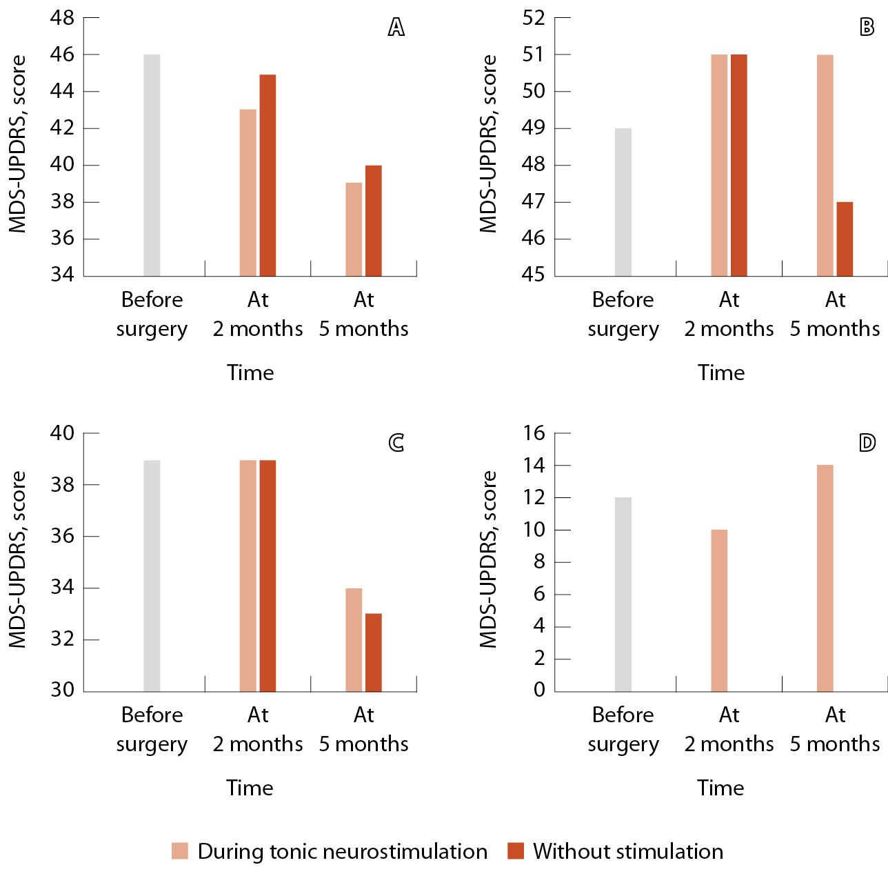Оценку пациентов по шкале MDS-UPDRS выполняли на фоне продолжающейся тонической нейростимуляции и через 1 неделю после ее отмены. Оценить неврологический статус пациента 4 вне стимуляции не удалось вследствие невозможности его госпитализации. Через 2 и 5 месяцев после операции только у пациента 1 определялась тенденция к снижению баллов по шкале MDS-UPDRS; часть III (оценка на фоне стимуляции спустя 2 месяца после хирургического лечения снизилась на 6;5%; спустя 5 месяцев – на 15;2%). У остальных же пациентов динамика была разнонаправленной (рис. 1).