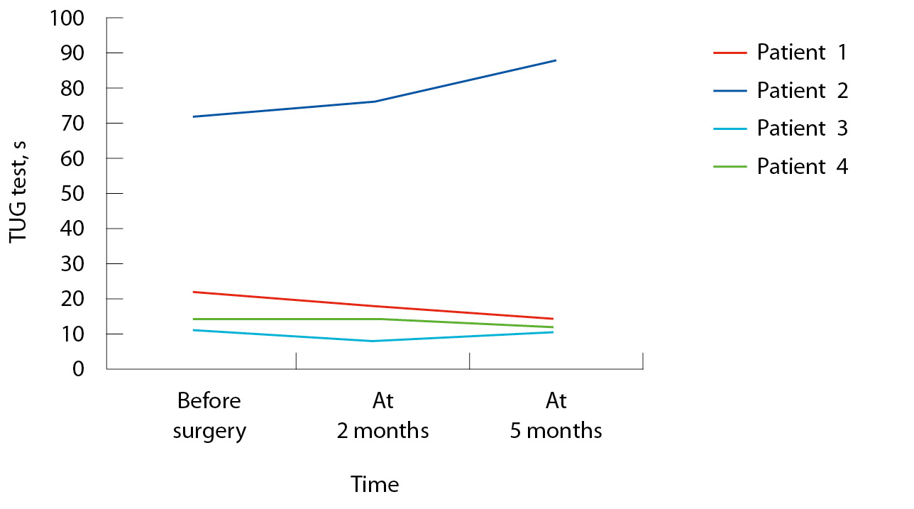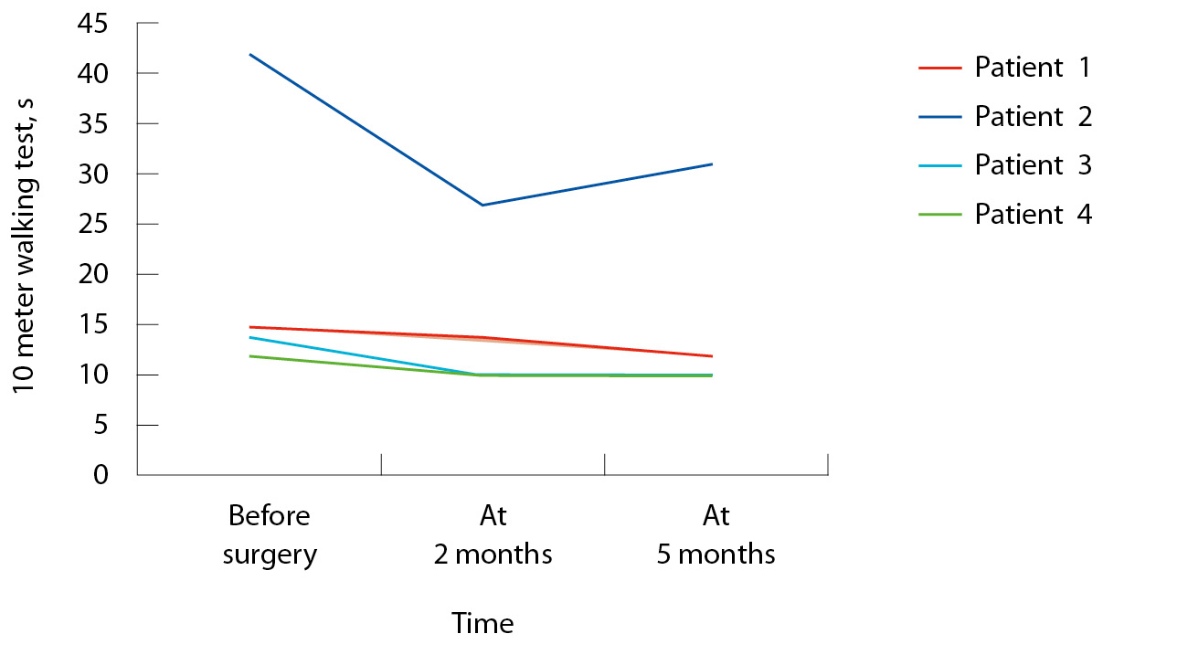 Несмотря на отсутствие четкого тренда на регрессию баллов по шкале MDS-UPDRS; часть III; у 3 из 4 пациентов регистрировали улучшение ходьбы при выполнении TUG-теста (рис. 2) и увеличение скорости прохождения дистанции в 10 метров (рис. 3). Исключение составил пациент 2; имевший исходно существенно более тяжелый функциональный статус. По результатам оценки по опросникам ABC и PDQ-8 на 2-й месяц после хирургического лечения все пациенты отмечали улучшение; однако к 5-му месяцу вновь возникала тенденция к субъективному ухудшению состояния (таблица).