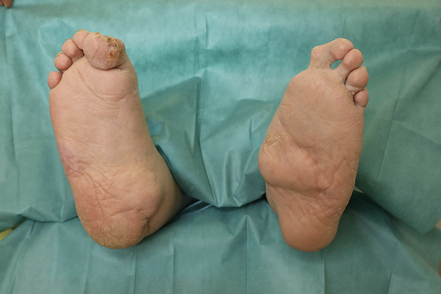 Рис. 2. Внешний вид стоп пациента Т. Кожа стоп и голеней теплая, сухая. Деформация обеих стоп по типу Шарко, уплощение поперечно-продольного свода. Ампутация I пальца левой стопы с резекцией головки плюсневой кости, послеоперационный рубец без признаков воспаления. На подошвенной поверхности I пальца правой стопы язвенный дефект округлой формы до 0,5 см в диаметре, в дне раны зондируется кость