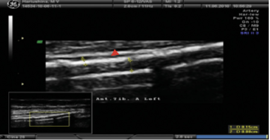 Рис. 4. Эхограмма пациента Т. Левая передняя большеберцовая артерия. Визуализируется диффузное относительно равномерное повышение эхогенности сосудистой стенки в сочетании с утратой дифференцировки на слои на всем протяжении (красная стрелка). Эхографические тени от повышенного содержания солей кальция фрагментарно перекрывают просвет и нижнюю стенку сосуда (желтые стрелки)