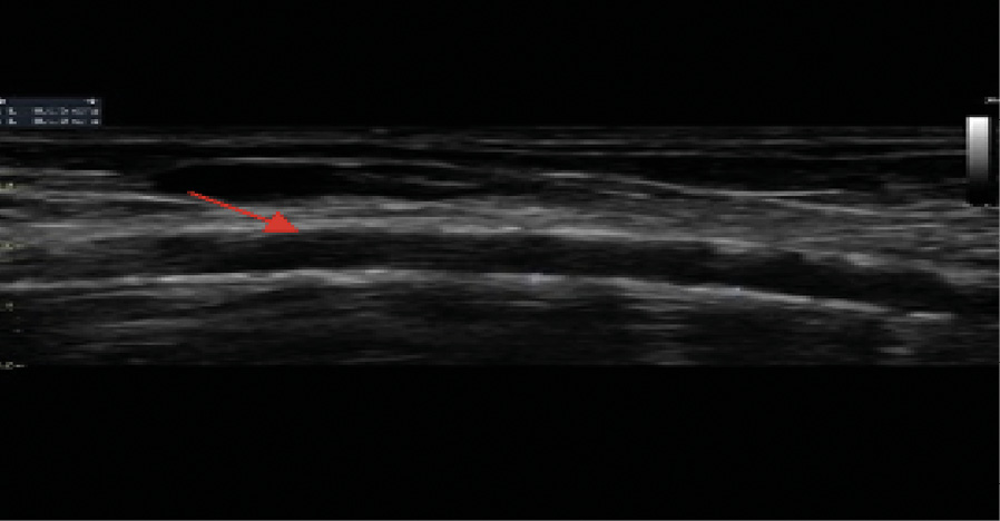 Рис. 5. Эхограмма пациента Т. Ультразвуковое дуплексное сканирование артериовенозной фистулы левой верхней конечности. Обызвествление стенок плечевой артерии артериовенозной фистулы левой верхней конечности (указано стрелкой)